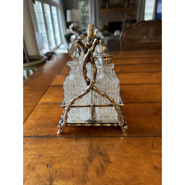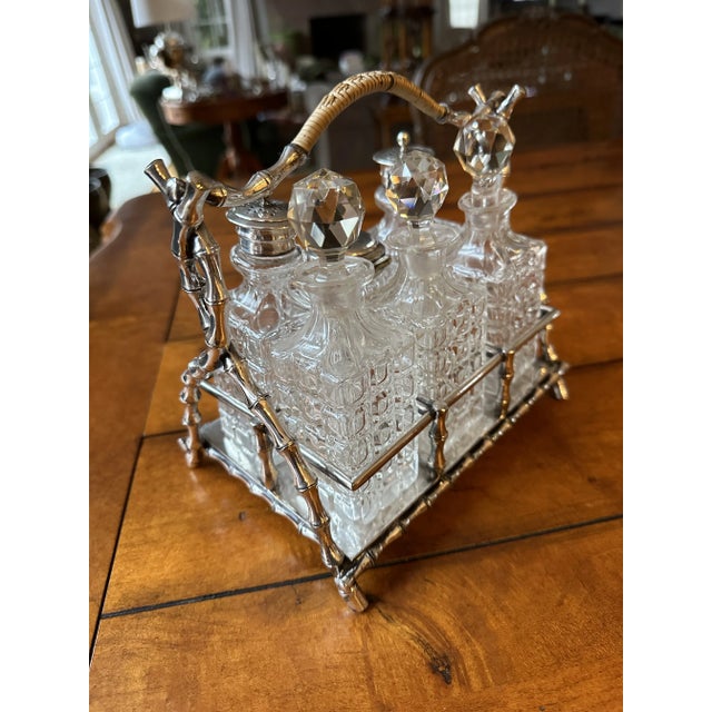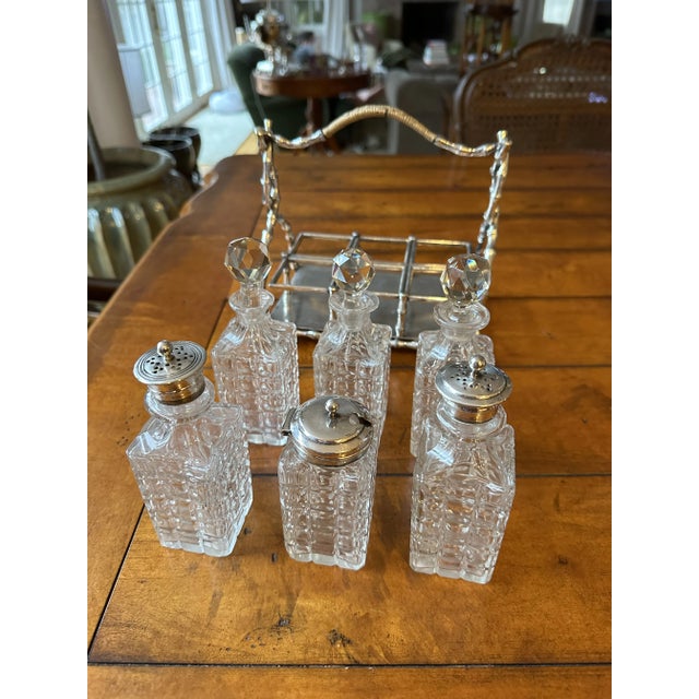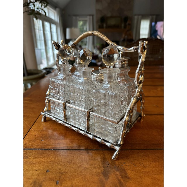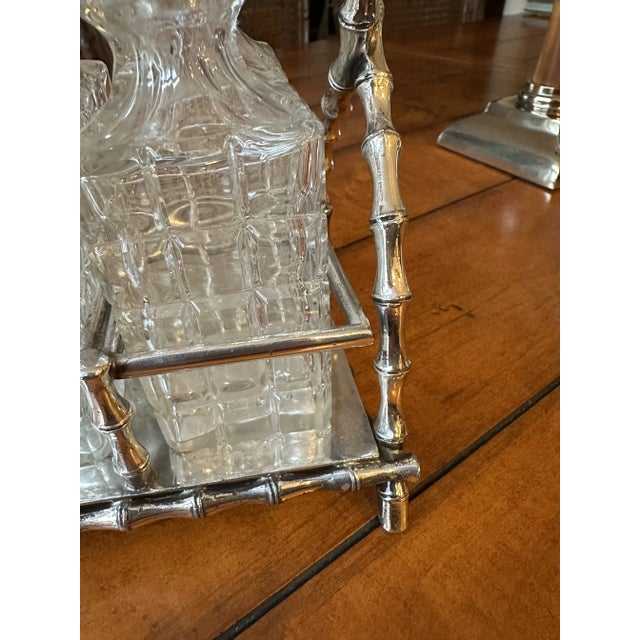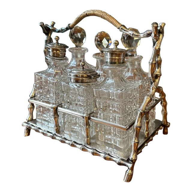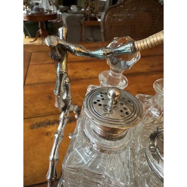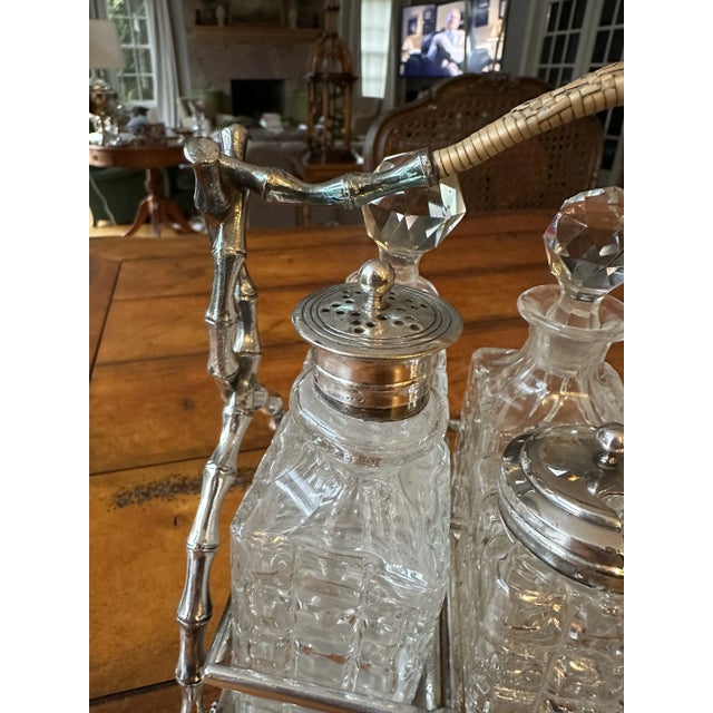 Featuring bamboo-form Sheffield silver plate, the stand's naturalistic form reflects the Victorian fascination with botanical themes. The set includes finely cut crystal bottles, each designed to hold condiments or sauces, adding both function and sophistication.