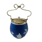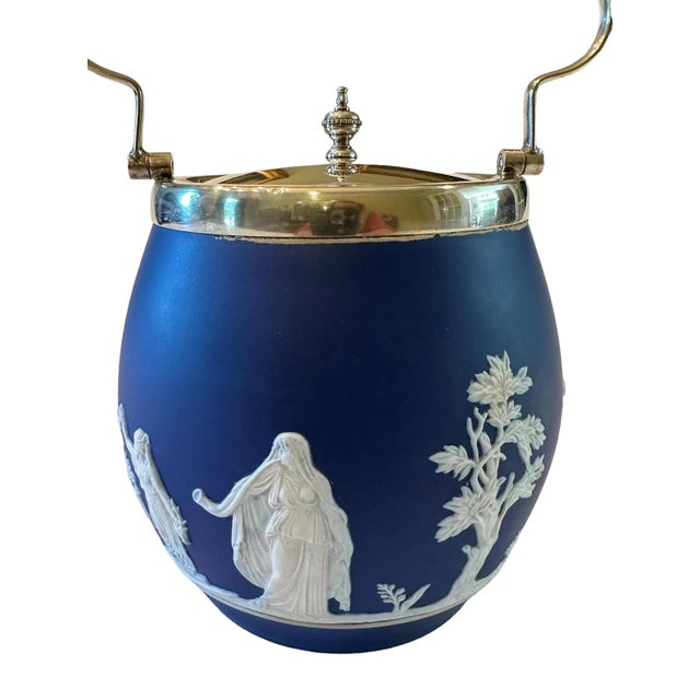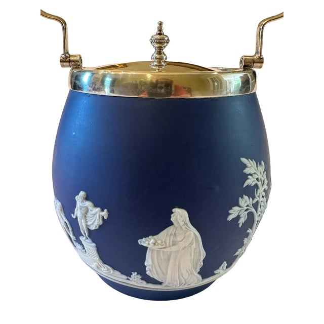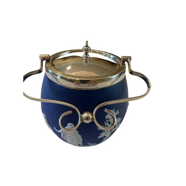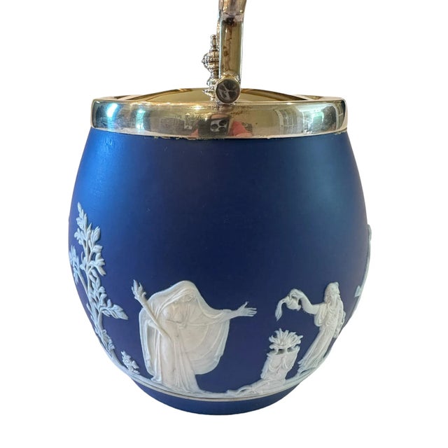 This antique Wedgwood Jasperware ice bucket in cobalt blue and white is a rare find.