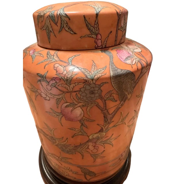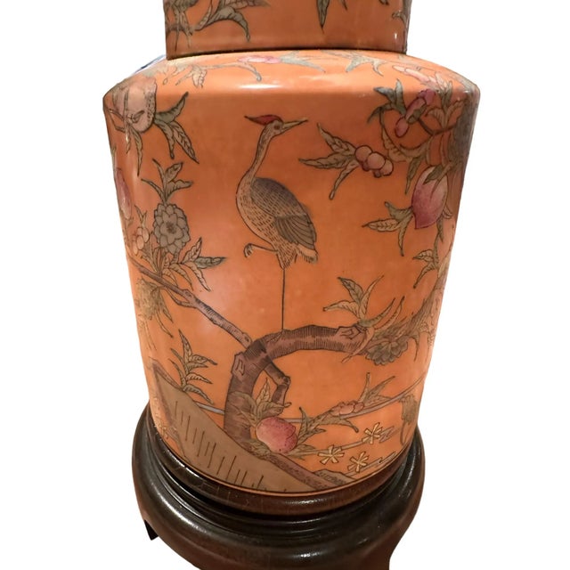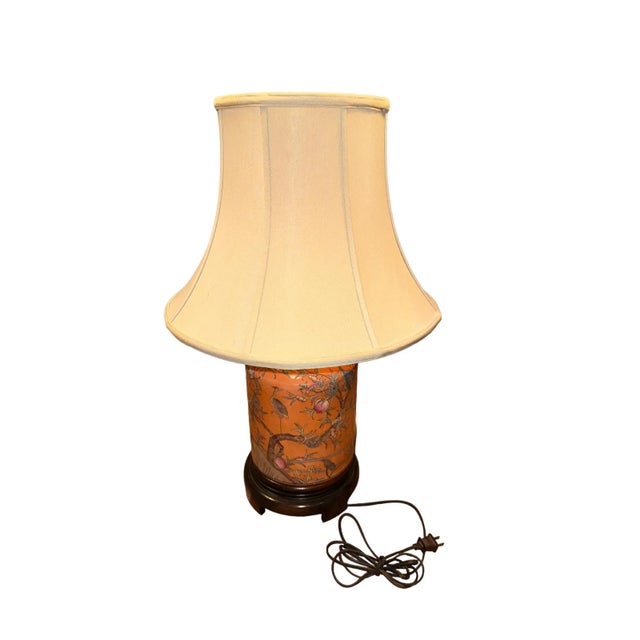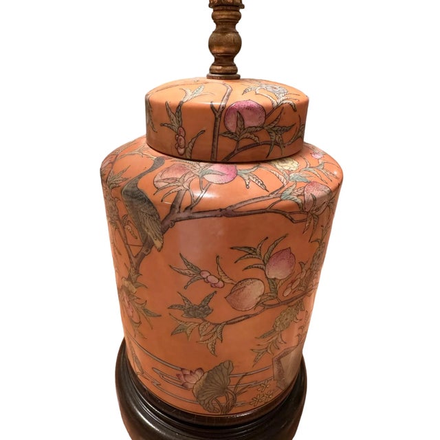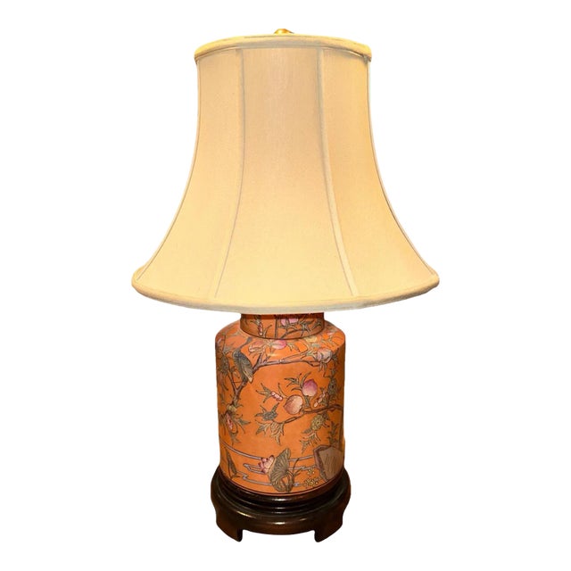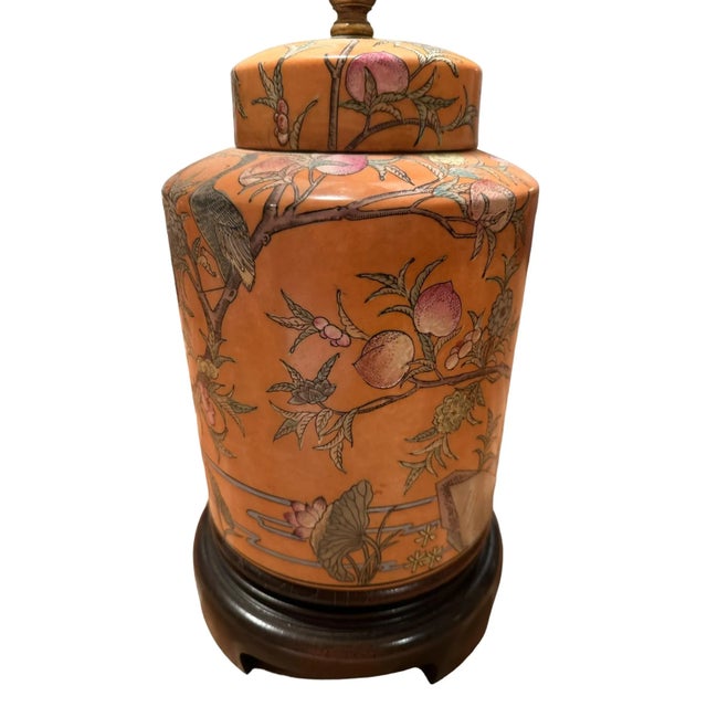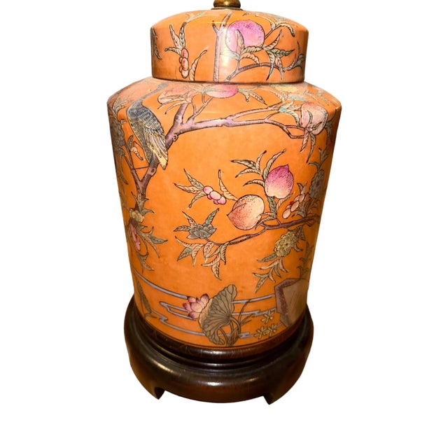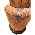 Late 20th Century Hand-Painted Orange Chinoiserie Lamp With Bird and Floral Motif