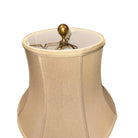 This lovely piece includes a tan shade and is in working order. The pattern features several cranes perching on peach tree branches in front of a riverbed. The base is dark wood.