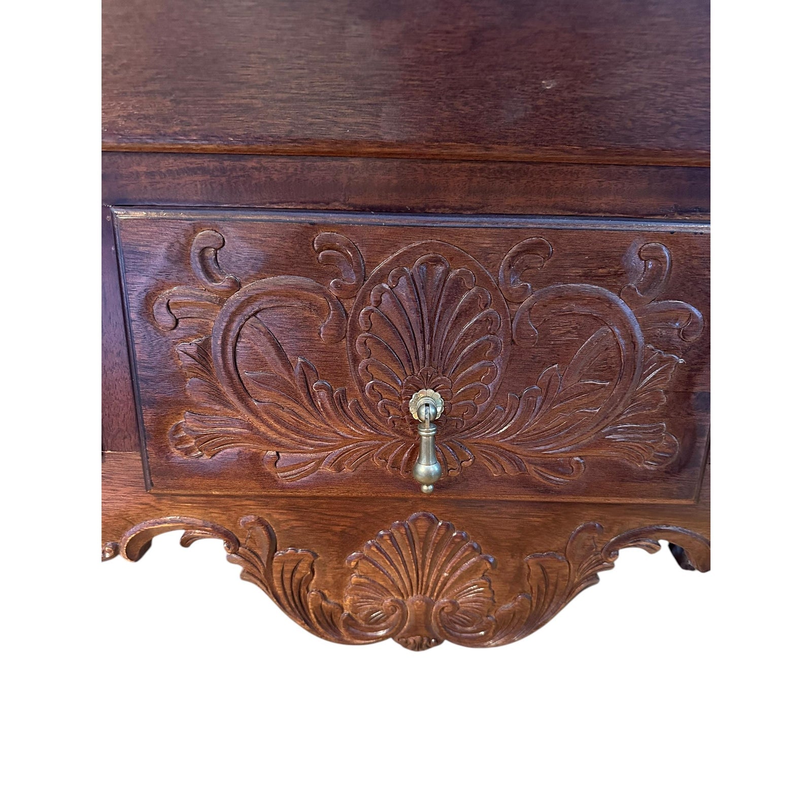 This exquisite Chippendale-style armoire by National Mount Airy is a testament to fine craftsmanship and timeless design. Featuring an intricately carved pediment, this piece exudes classic elegance and architectural grandeur. The many drawer slide open to reveal ample storage, making it both a functional and sophisticated addition to any bedroom, living space, or study.