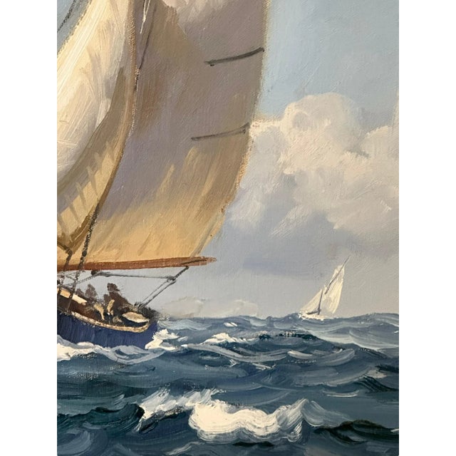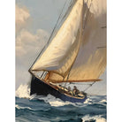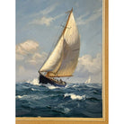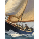 This energetic and detailed painting features a beautiful sailboat with billowing sails, heeling over in the brisk wind. The sea is swollen with white capped waves and the sky is a vivid blue.