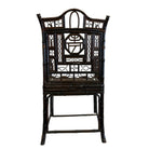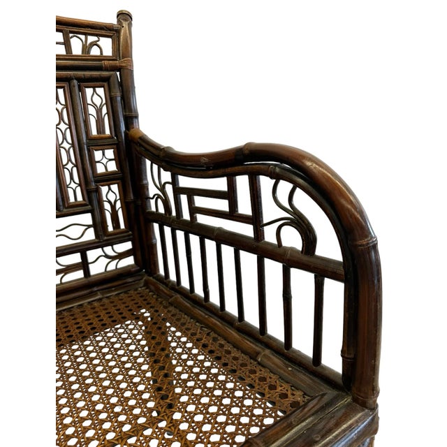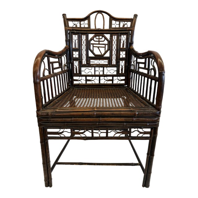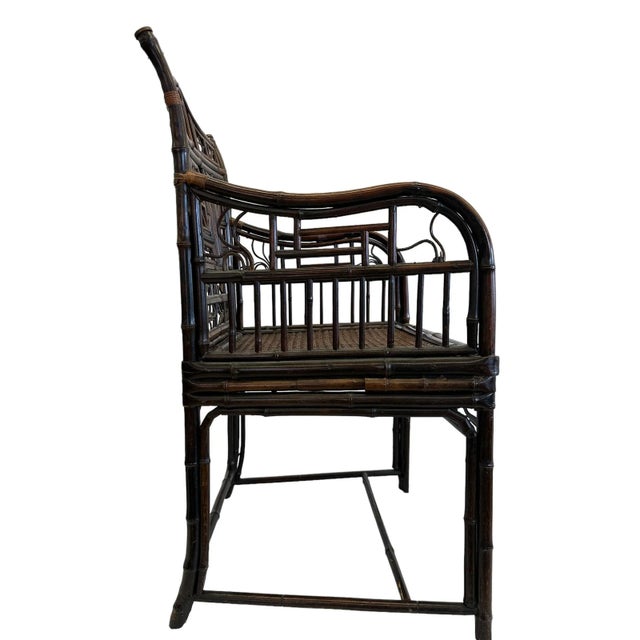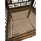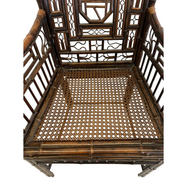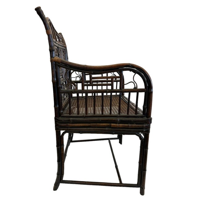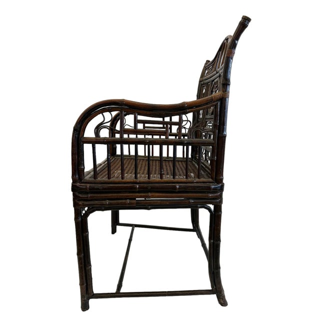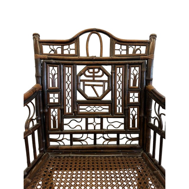 The chair features a solid bamboo frame with a caned seat and a back featuring ornate bamboo spindles and scrolling designs.