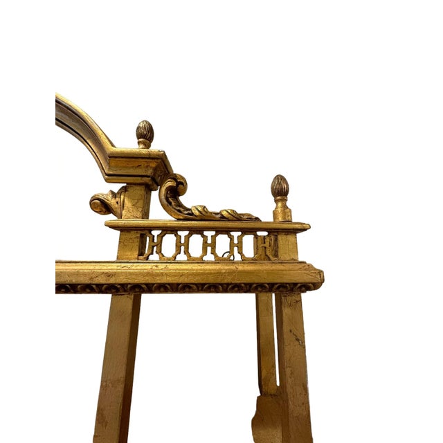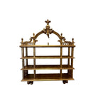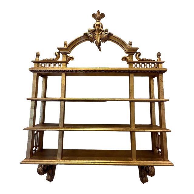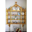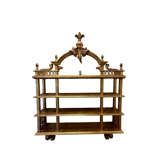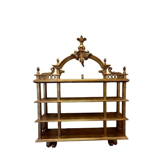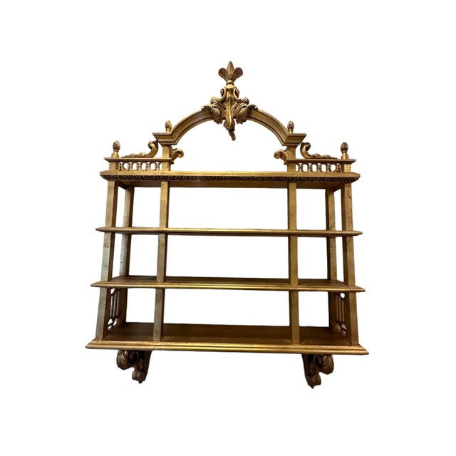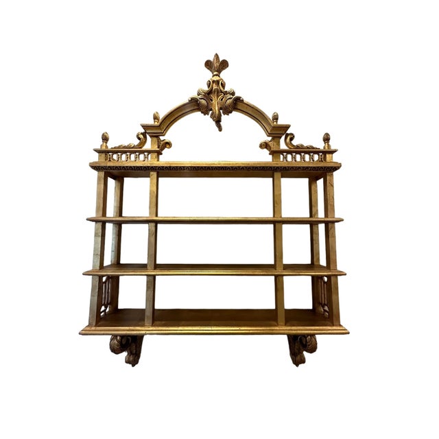 The intricate scrollwork at the base and delicate ornamentation of the finials at the top of the shelf are reminiscent of classic Italian design.