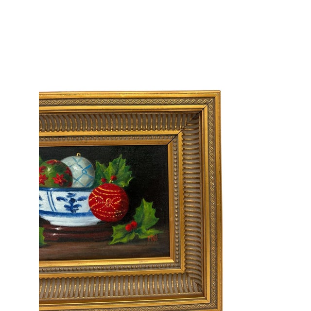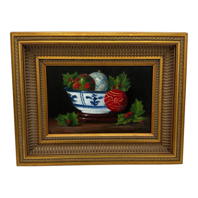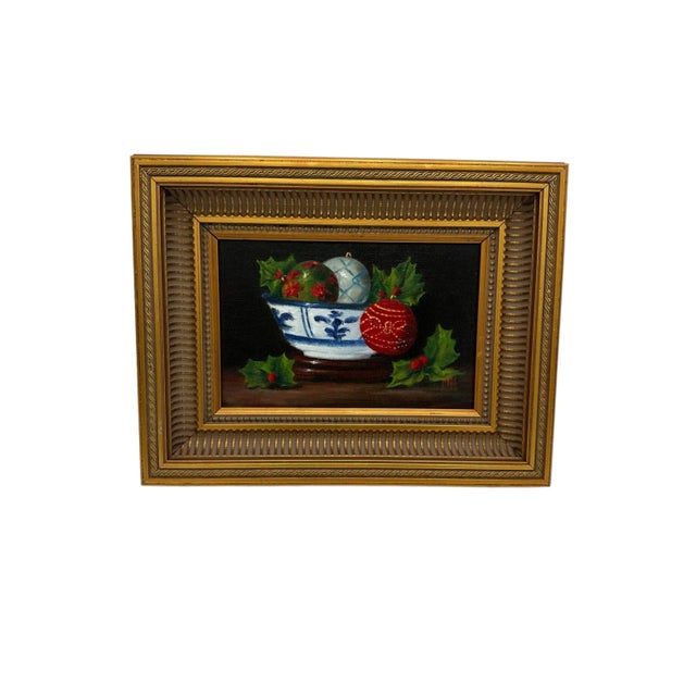 This Christian McCall features ornaments and holly with red berries sitting inside of a blue and white chinoiserie bowl. McCall is continually trying to achieve sensitivity to shape, form and light as inspired by the Masters of the 18th and 19th centuries, and this painting is a perfect example of his work. One can see the light reflecting off the bowl and ornaments in contrast to the dark surroundings.