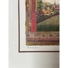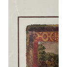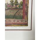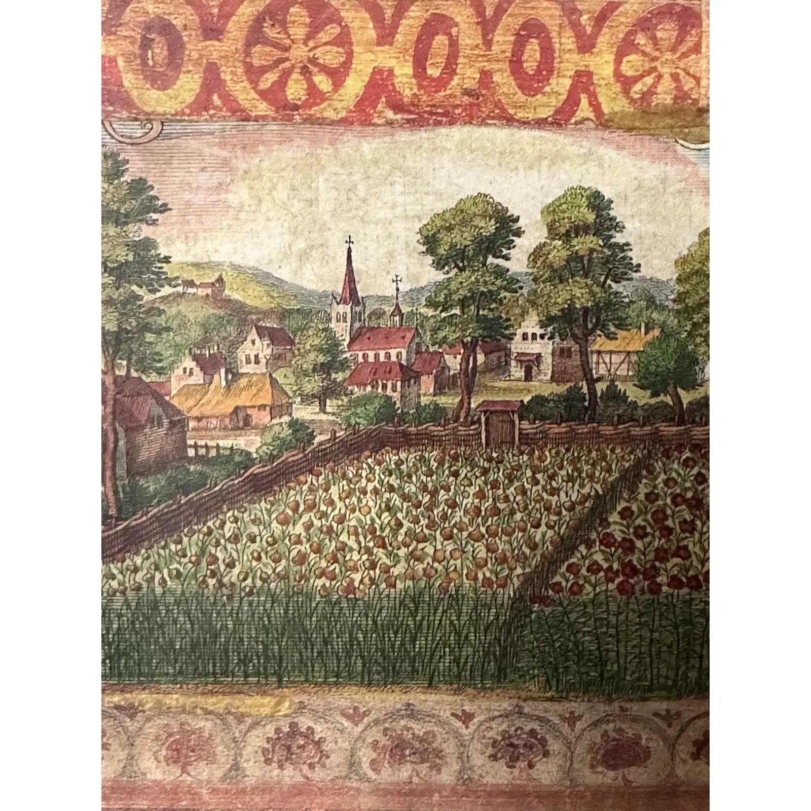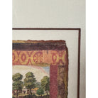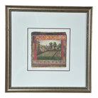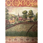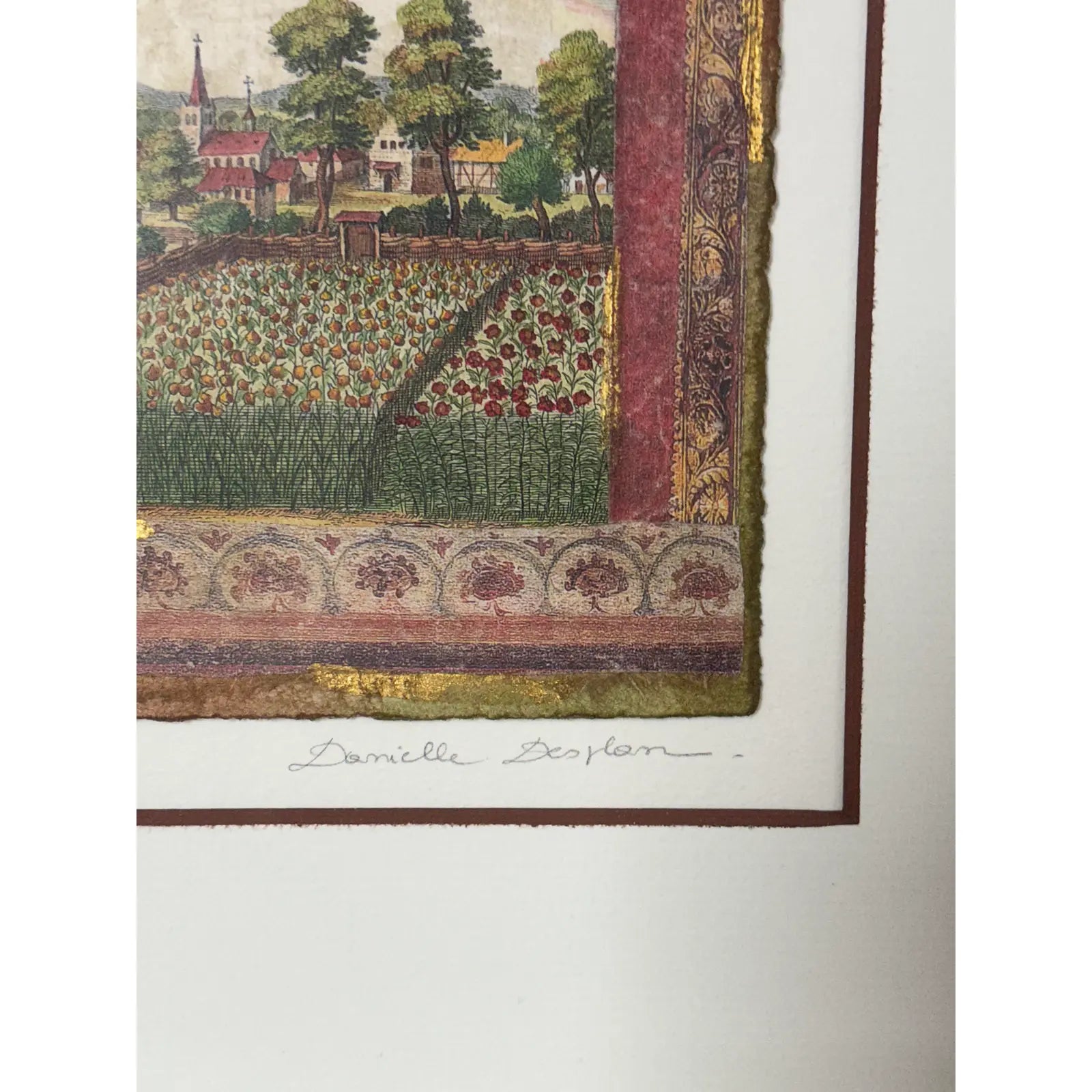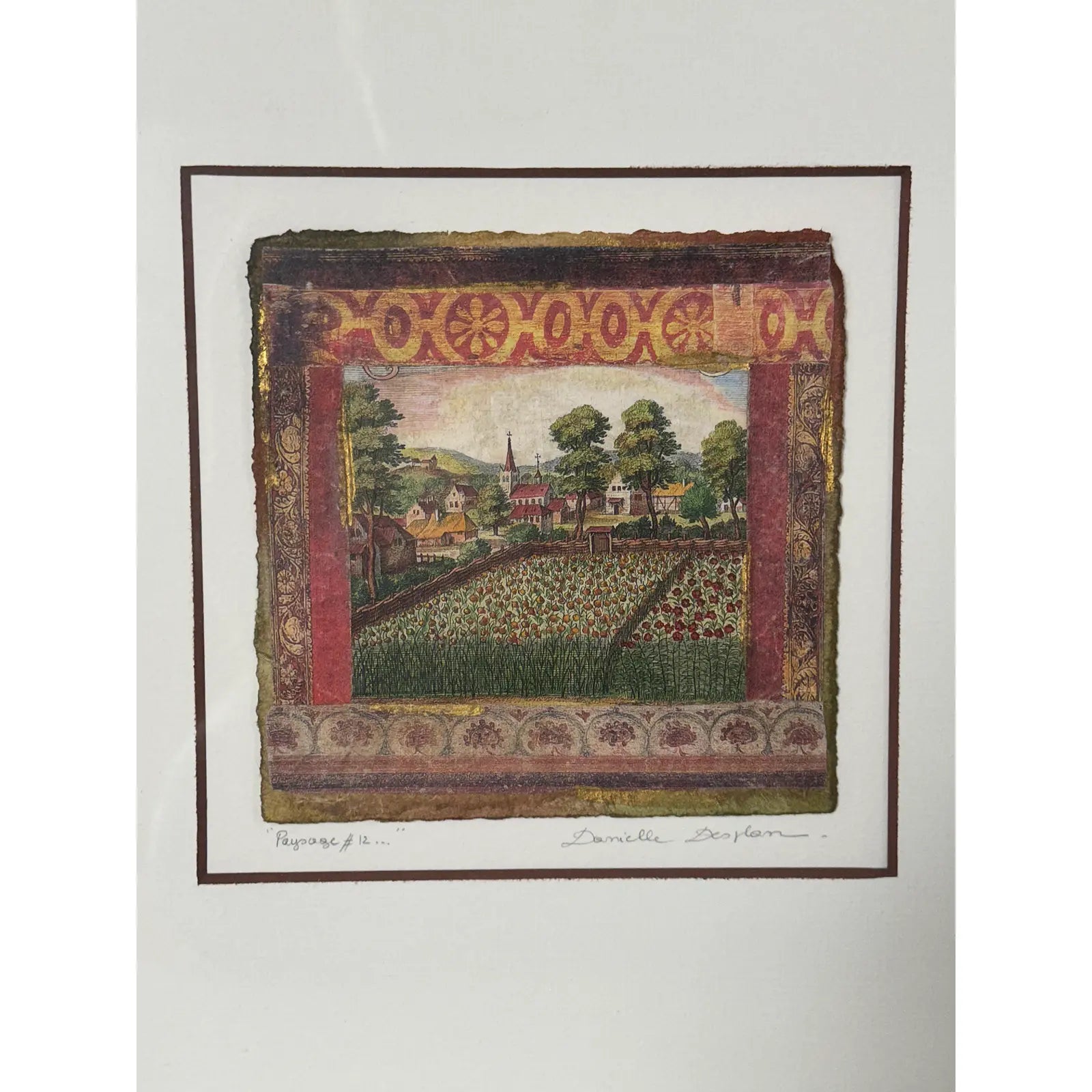 This collage features a French provincial village with red roofed houses and church steeples. The foreground of this mixed-media on paper features fields of orange tulips and red poppies. The borders of the collage feature flower motifs and gilt designs.