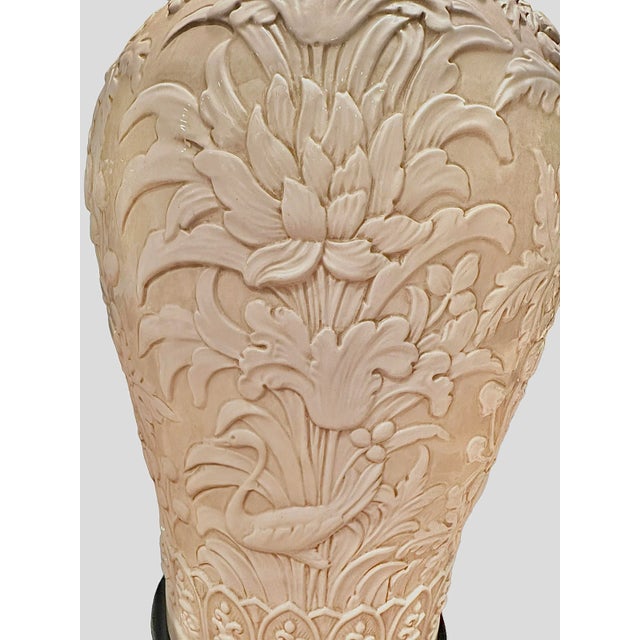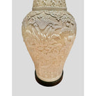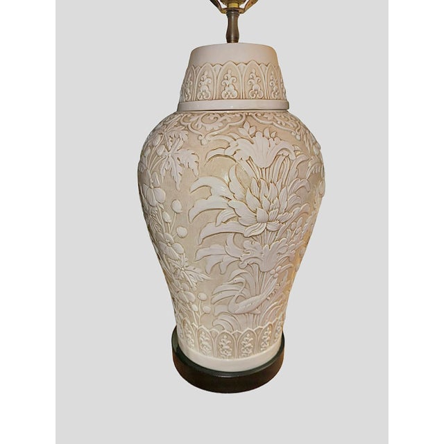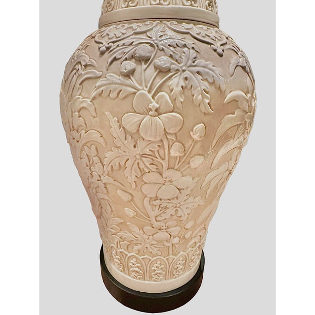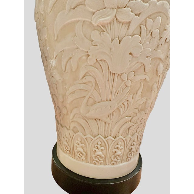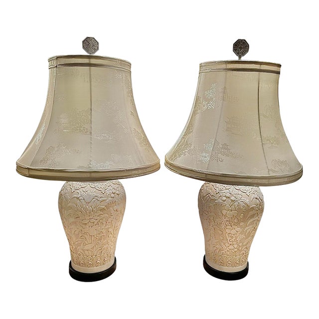 Pair of 1970s Chapman White Floral and Bird Relief Chinoiserie Lamps With White Silk Patterned Shades