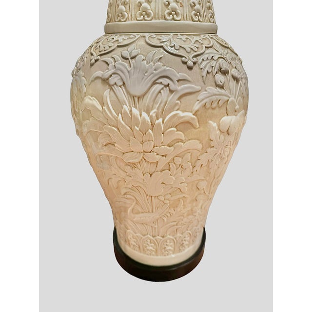 Stunning Pair of 1970s Chapman White Floral and Bird Relief Chinoiserie Lamps With White Silk Patterned Shades.