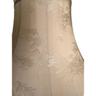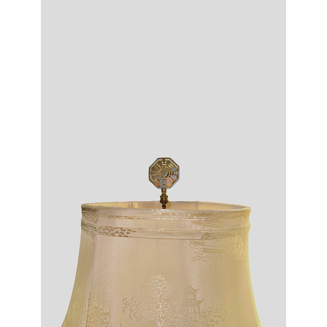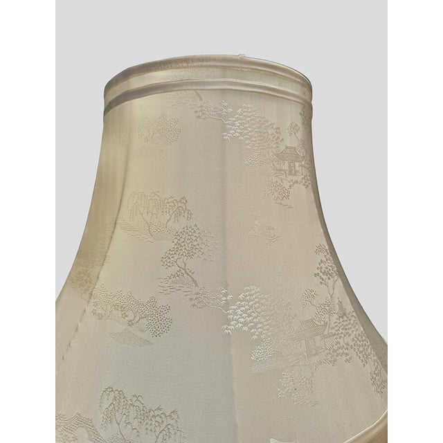 This pair features floral and bird motifs of an ibis walking amongst orchids, lotuses, leaves and other florals. The ivory silk shades feature several pagodas scattered in forests under weeping cherry trees and other flora.