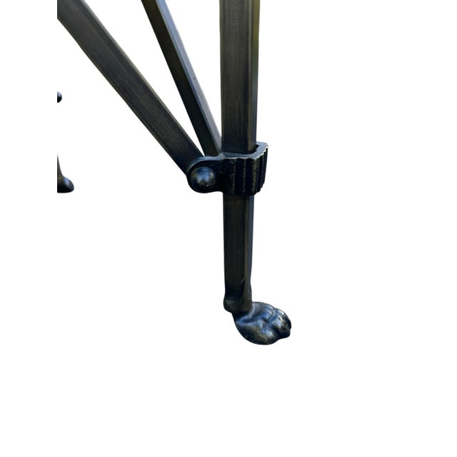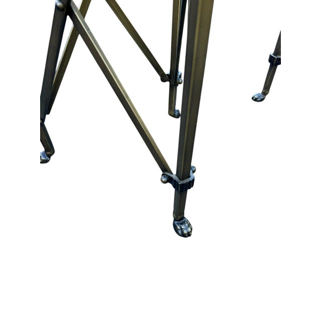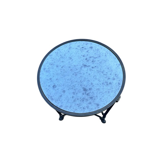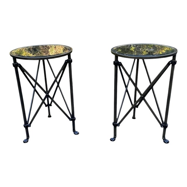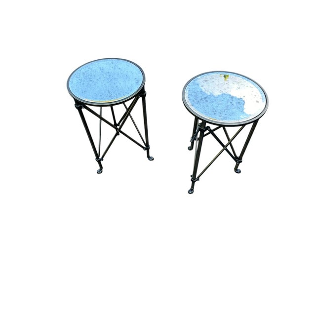 This Pair of Ballard Design Olivia Antiqued Mirrored Side Tables With Clawed Feet features an oil rubbed bronze.