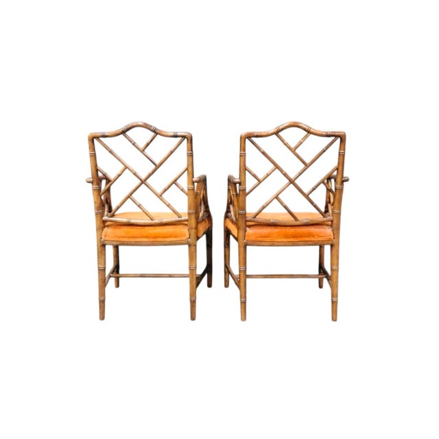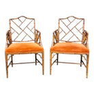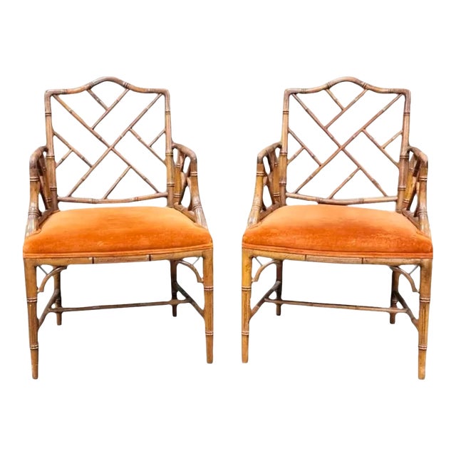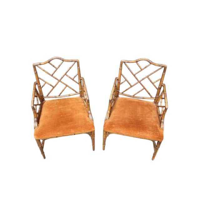 Pair of Late 20th Century Chippendale Faux Bamboo Arm Chairs With Persimmon Velvet Upholstery
