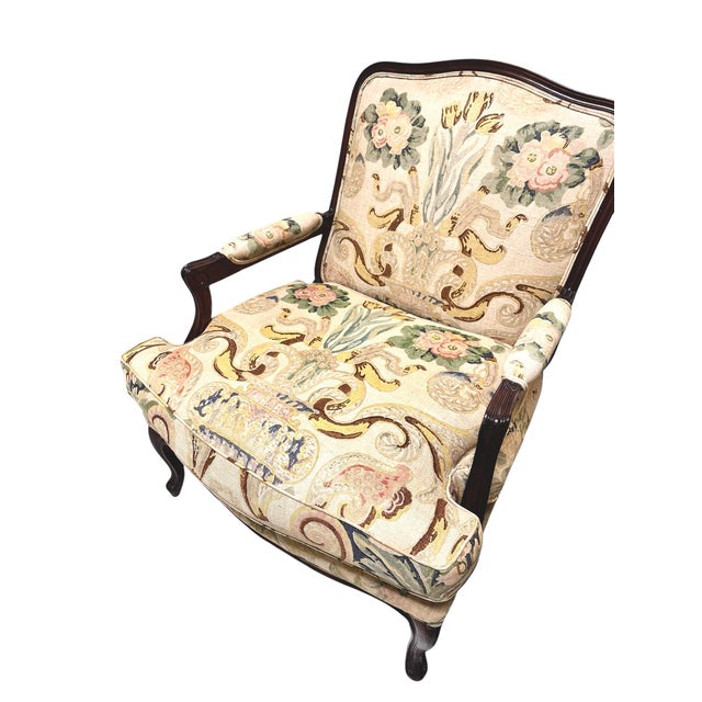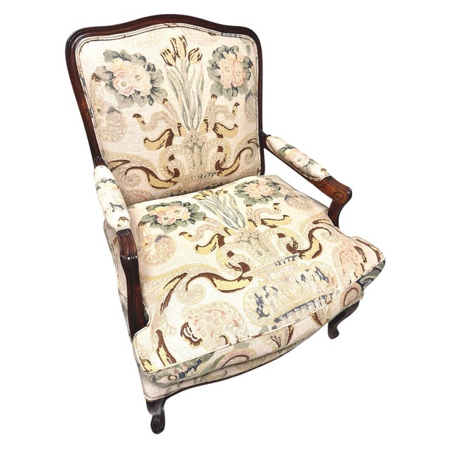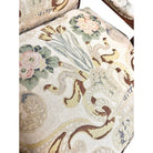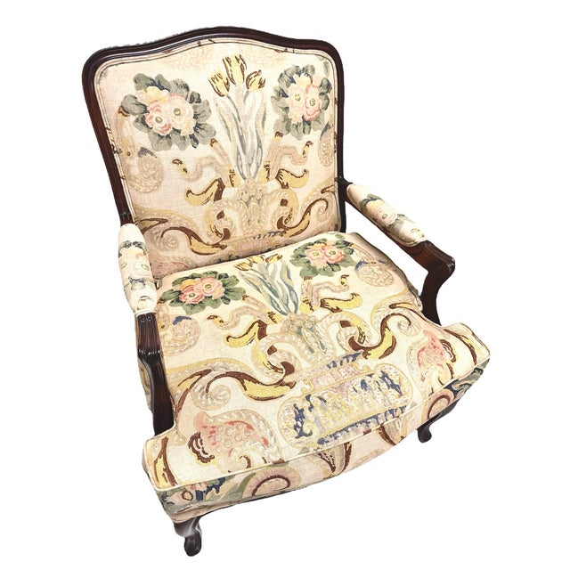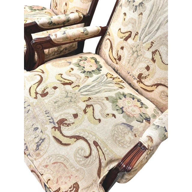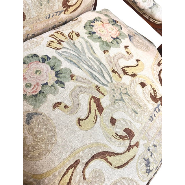 This exquisite pair or Bergère chairs are in mint condition, featuring custom linen botanical upholstery from Jon Paul Shriever. The linen features delicate floral scrolling motifs in light yellows, asparagus greens, light pinks and muted blues.