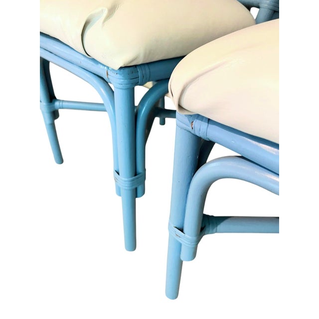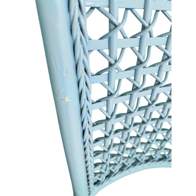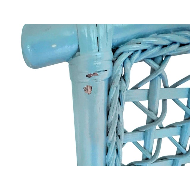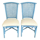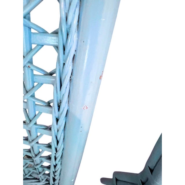 Pair of Vintage Sky Blue Painted Wicker Chairs With White Vinyl Seats