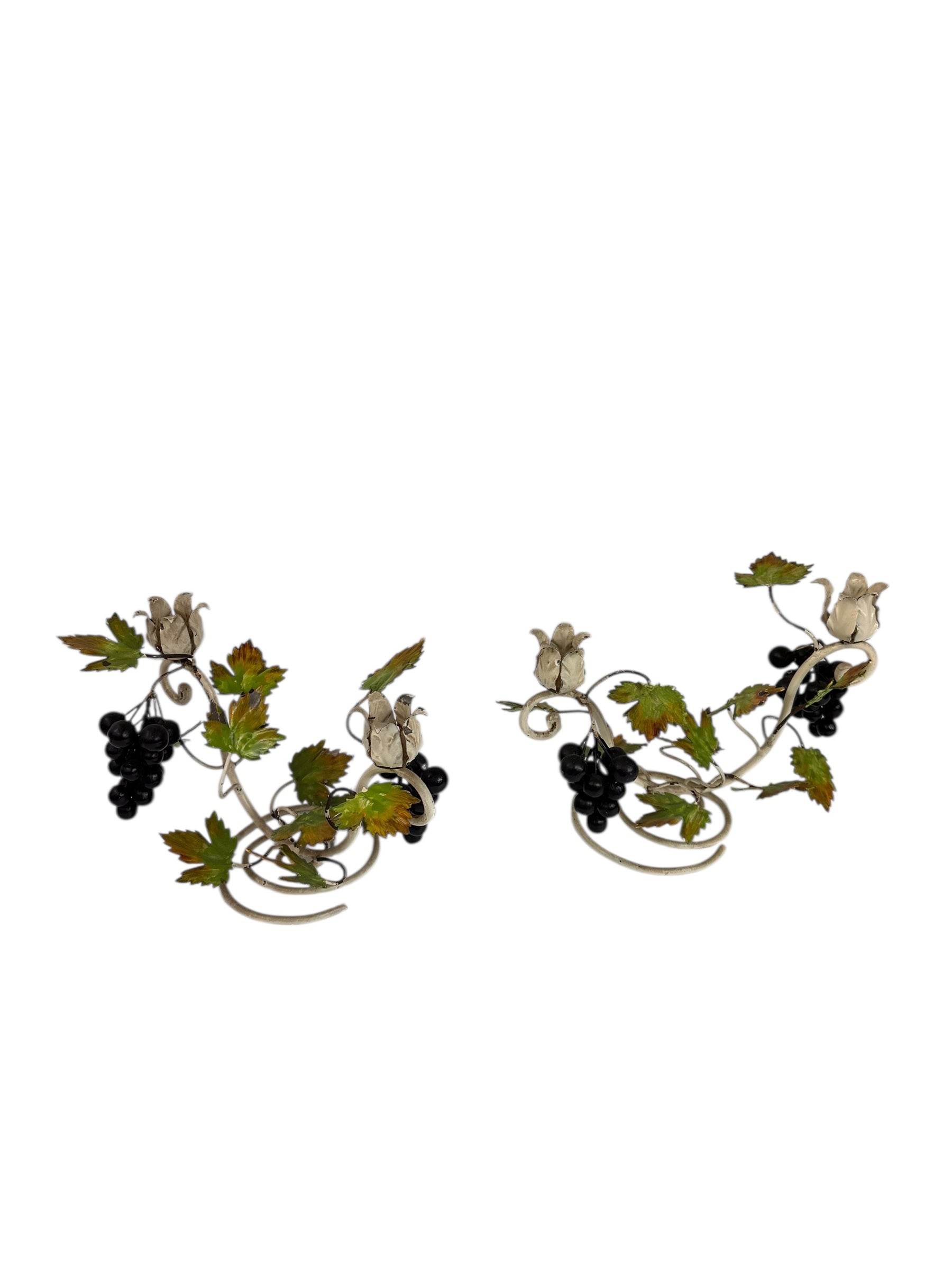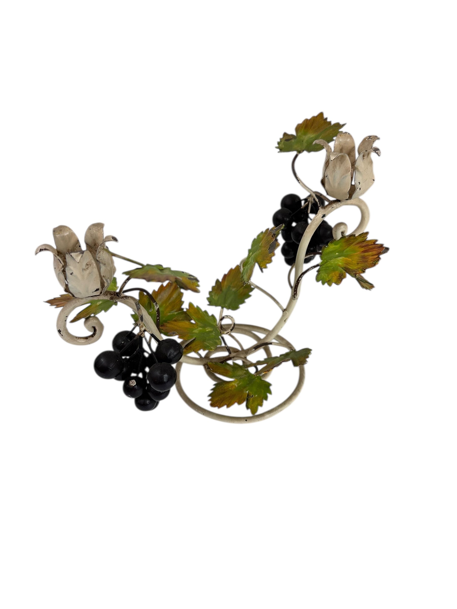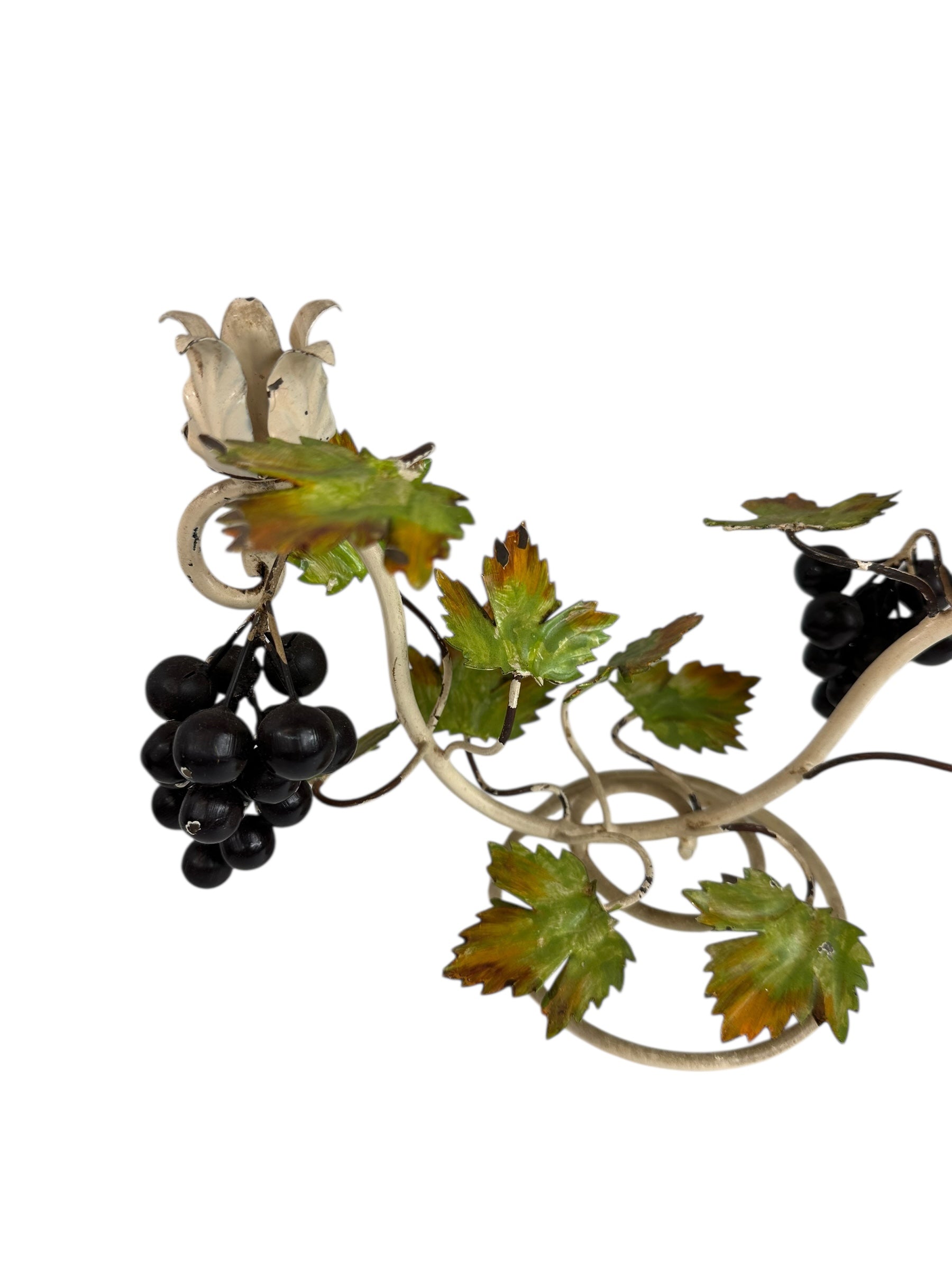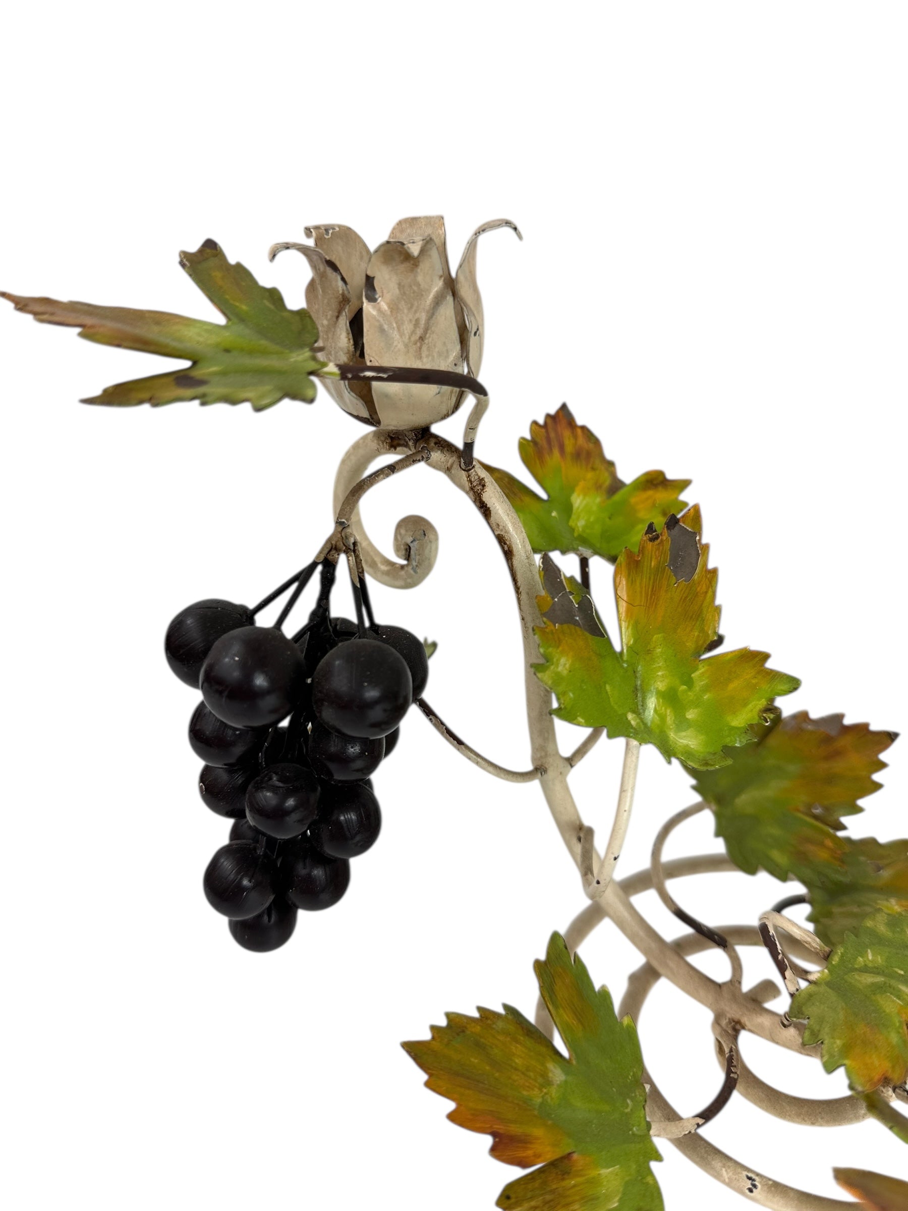 A charming pair of vintage Italian tole candlesticks, beautifully hand-painted in a grapevine motif. Each piece features curling ironwork branches adorned with clusters of black grapes, delicately shaped leaves in shades of green and ochre, and a sculpted floral candle cup at the top. The combination of naturalistic detail and aged patina captures the romantic appeal of mid-century Italian toleware.