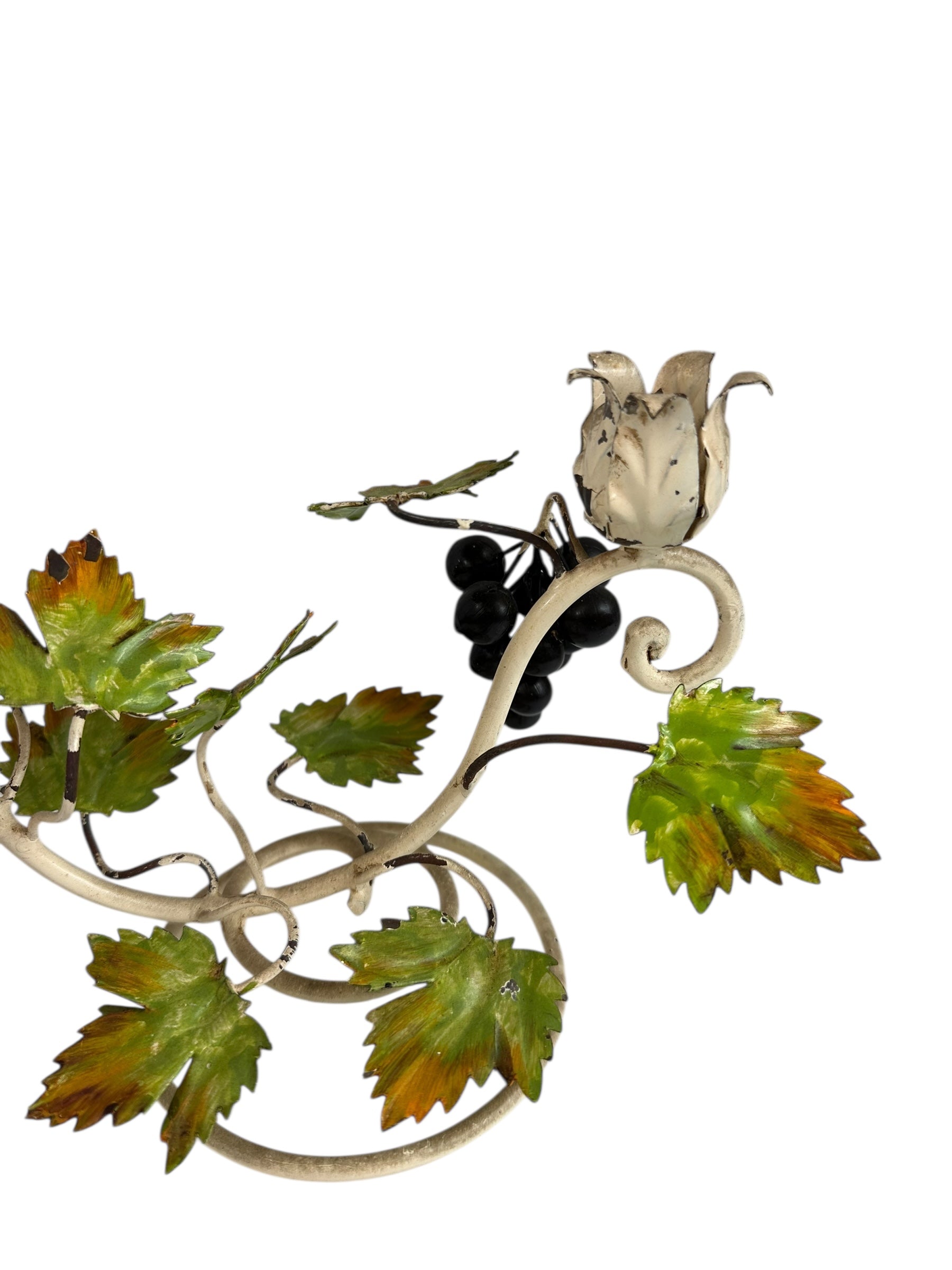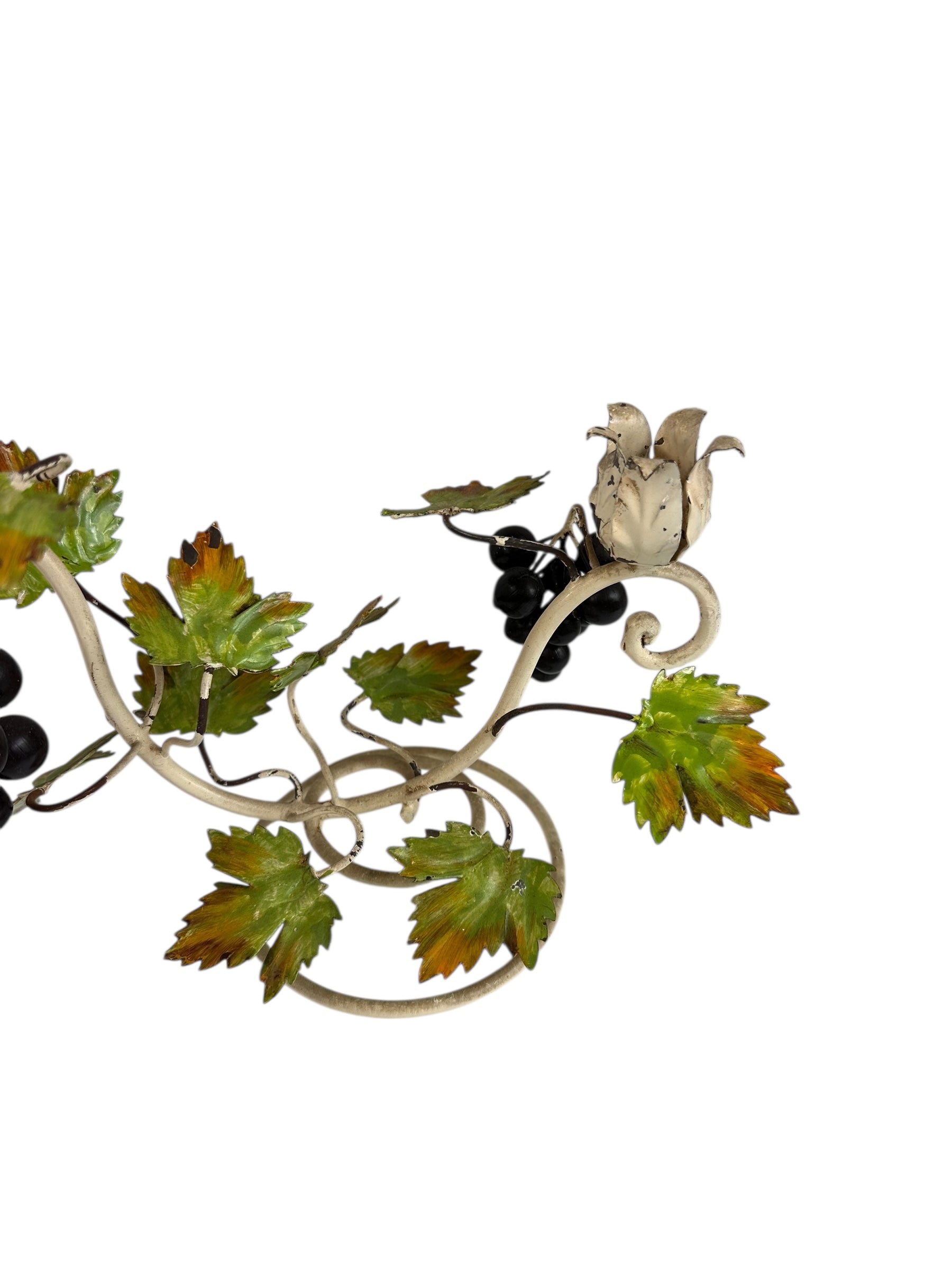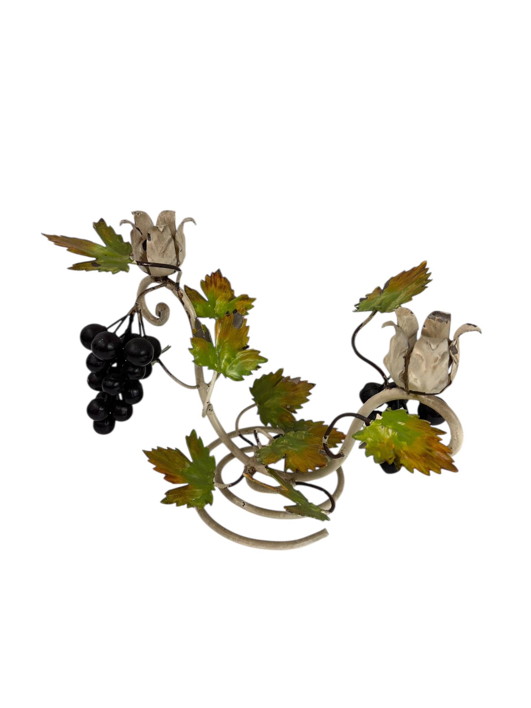 A charming pair of vintage Italian tole candlesticks, beautifully hand-painted in a grapevine motif. Each piece features curling ironwork branches adorned with clusters of black grapes, delicately shaped leaves in shades of green and ochre, and a sculpted floral candle cup at the top. The combination of naturalistic detail and aged patina captures the romantic appeal of mid-century Italian toleware.