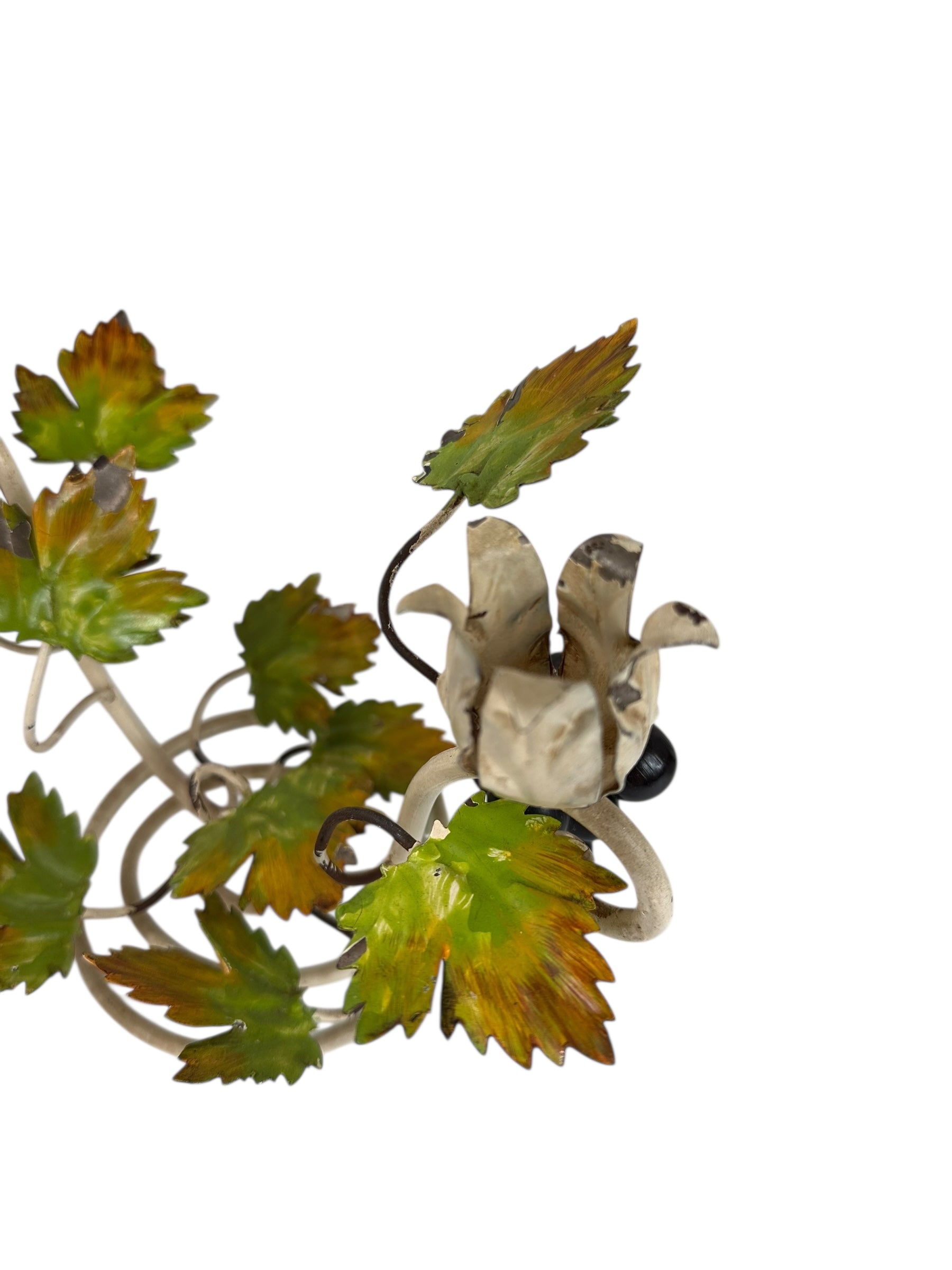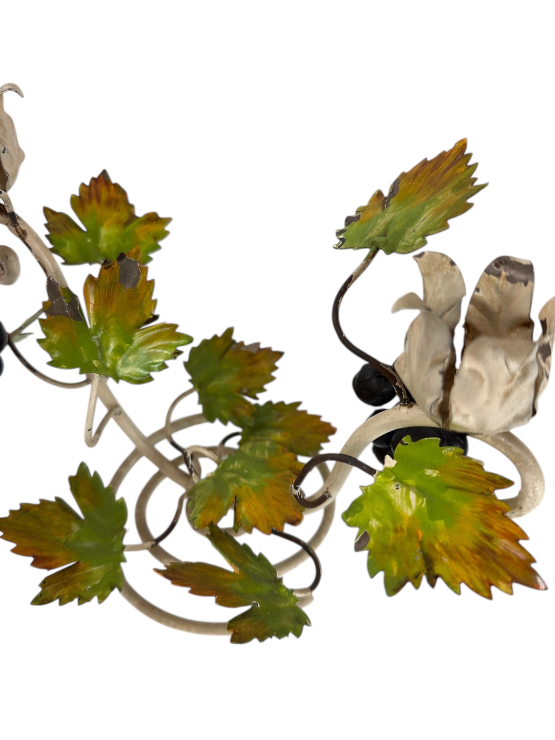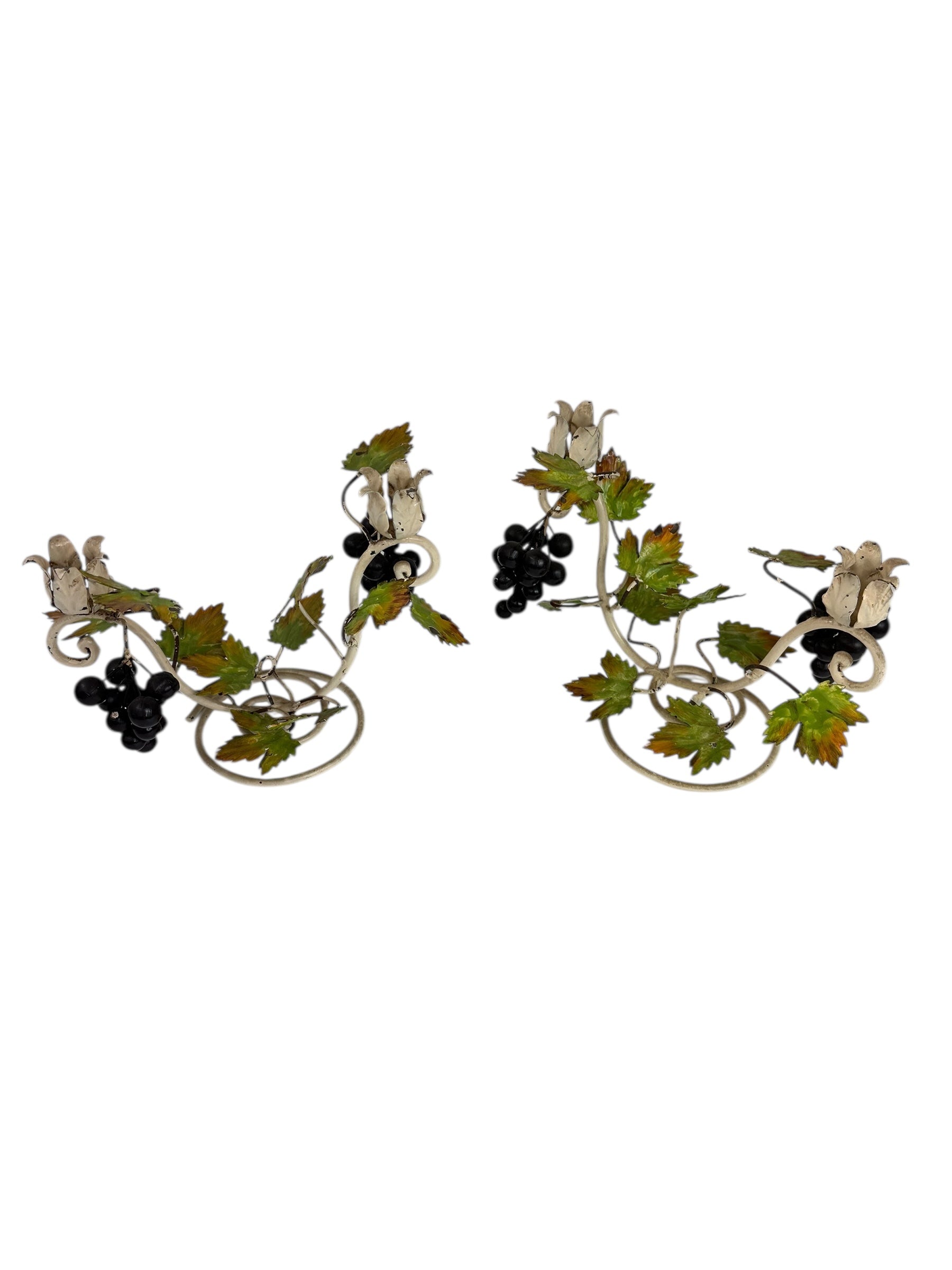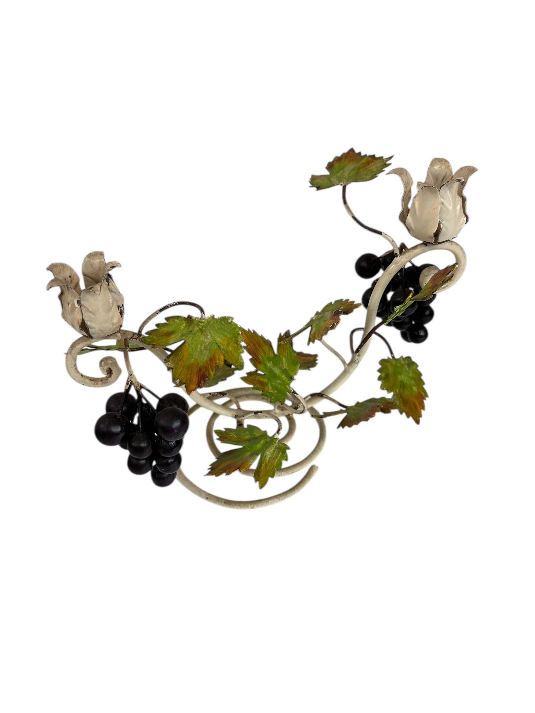 A charming pair of vintage Italian tole candlesticks, beautifully hand-painted in a grapevine motif. Each piece features curling ironwork branches adorned with clusters of black grapes, delicately shaped leaves in shades of green and ochre, and a sculpted floral candle cup at the top. The combination of naturalistic detail and aged patina captures the romantic appeal of mid-century Italian toleware.