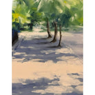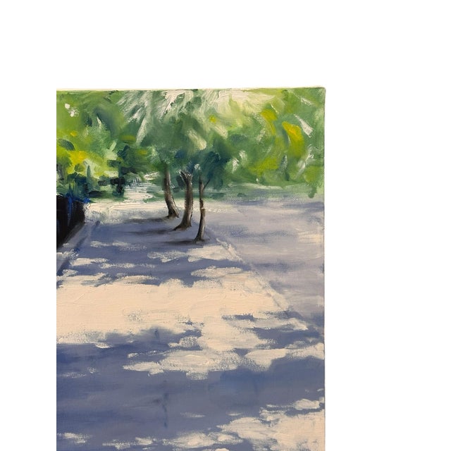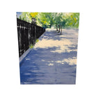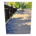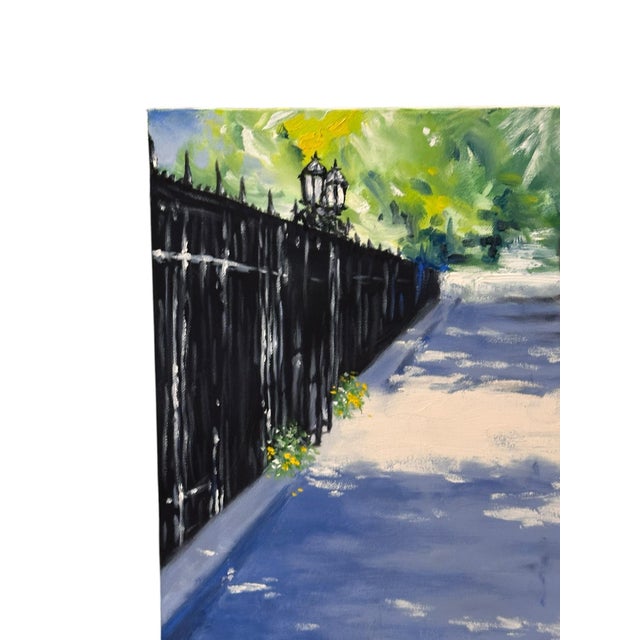 In a classic impressionist style, this beautiful sidewalk cityscape by Ron Savage depicts the early morning light against lush trees, the sidewalk and an impressive wrought iron gate.