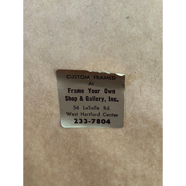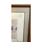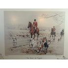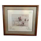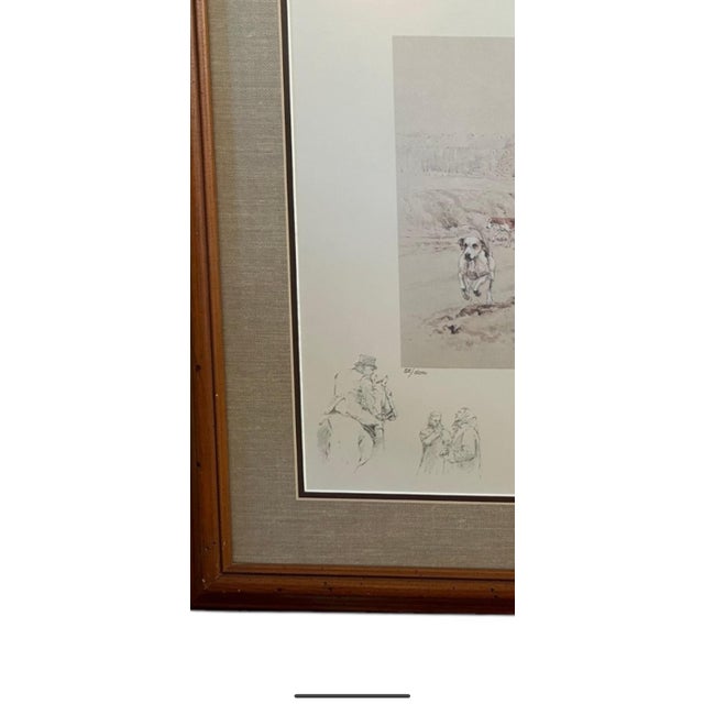 This signed print is custom framed with linen backing and features custom illustrations featuring dogs, horses and people on the matting. The central print features a fox hunt with a large pack of dogs.