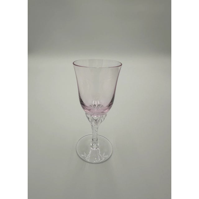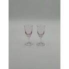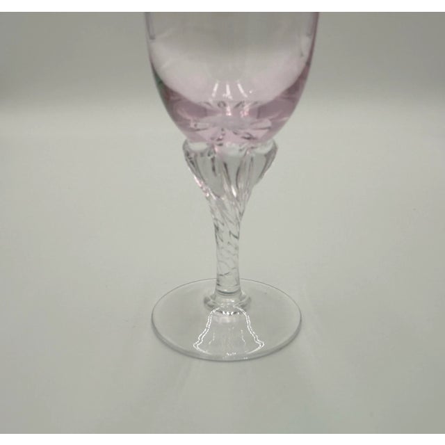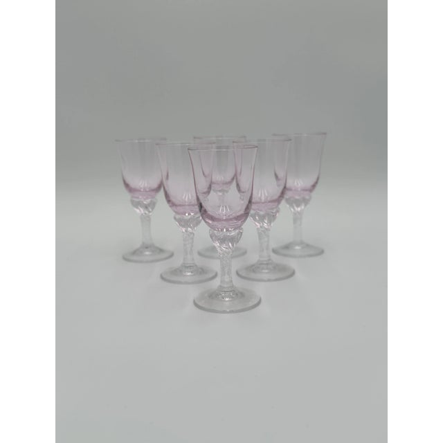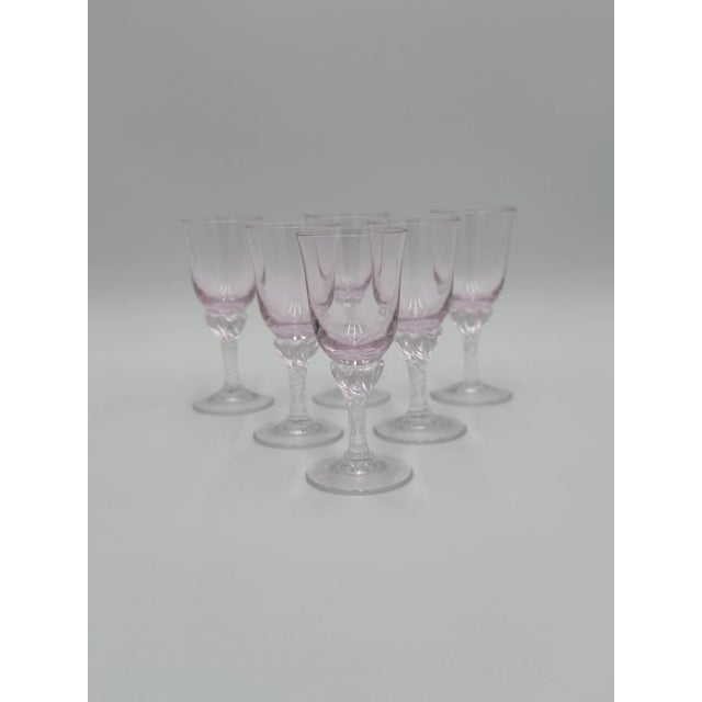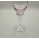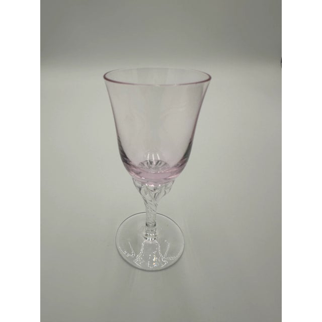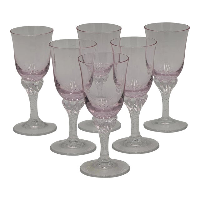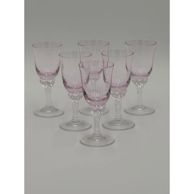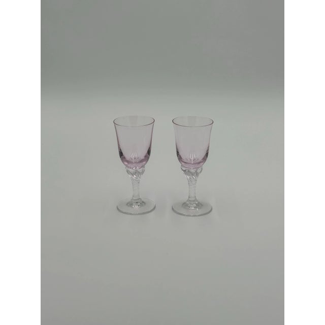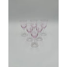 This set from the early 1990s features a delicate twisted stem design and thin pink crystal. As glass tapers to the stem, the crystal becomes more saturated with a unique pink color. The stem and base of the cordial glasses are transparent.