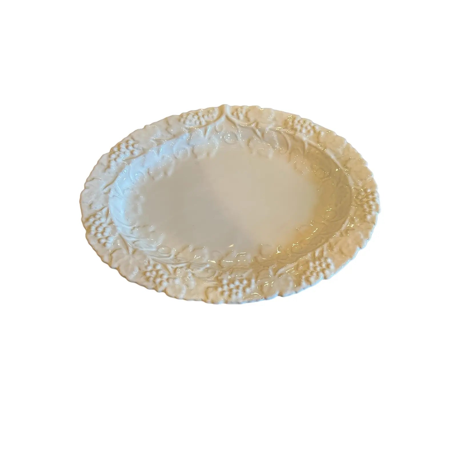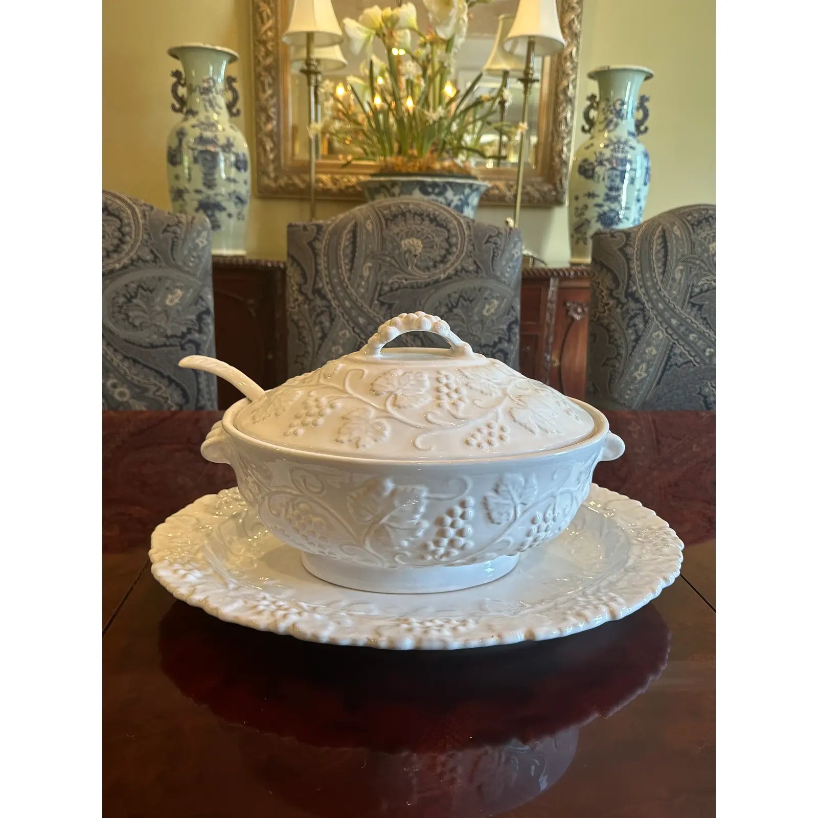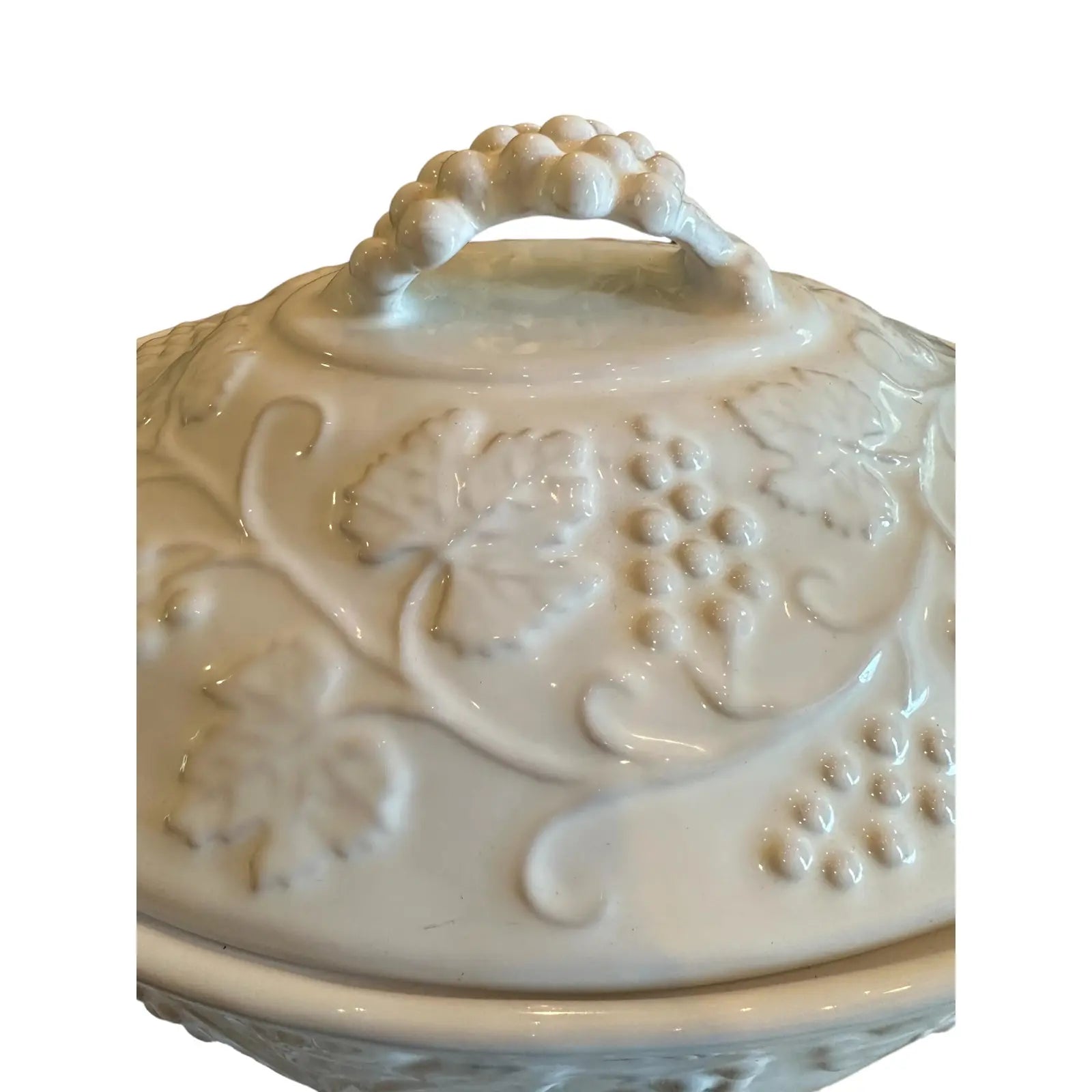 This piece features beautiful grape and grapevine reliefs across the lid and body of the tureen, as well as the border of the platter. This is a rare monochromatic Grazia Deruto piece. The piece was originally made exclusively for Westport's, the Stuart Collection.