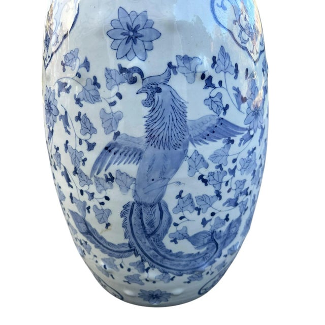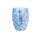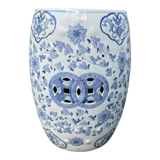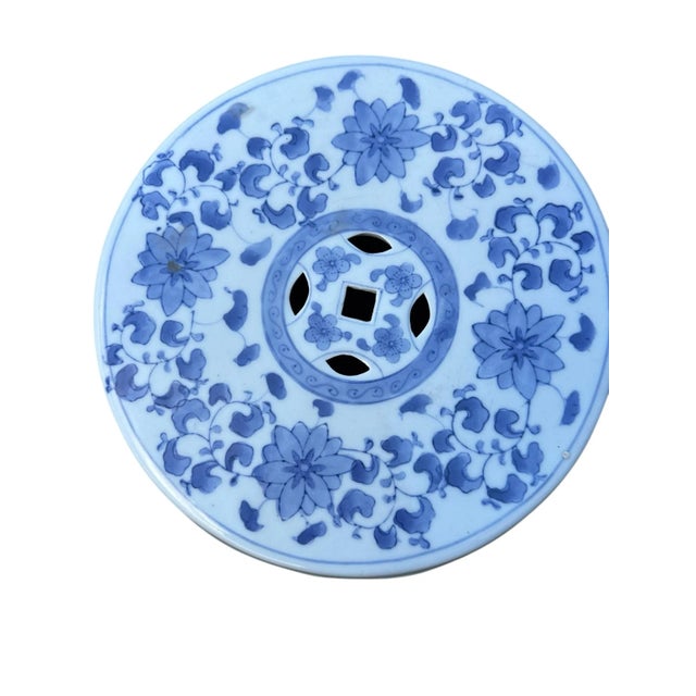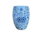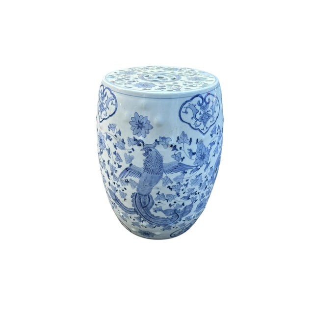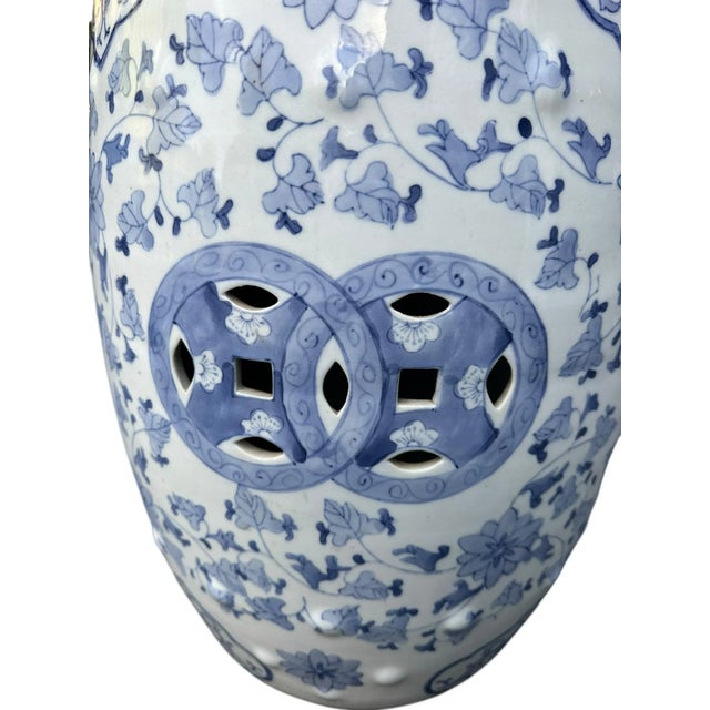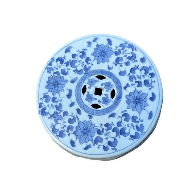 This blue and white Chinoiserie ceramic garden bench is a lovely example of traditional Eastern artistry with a modern decorative touch.