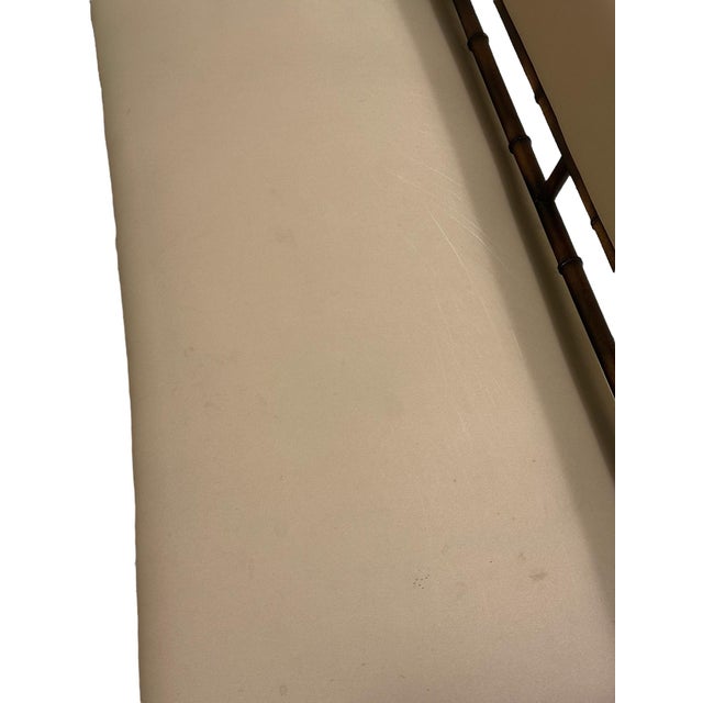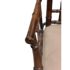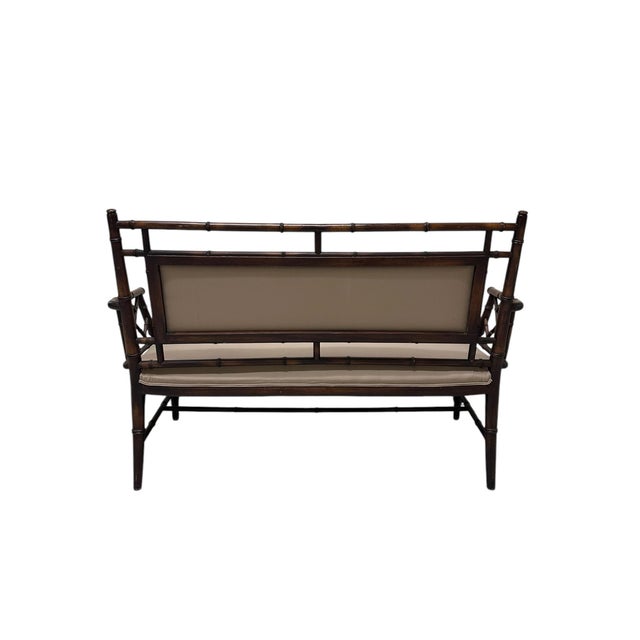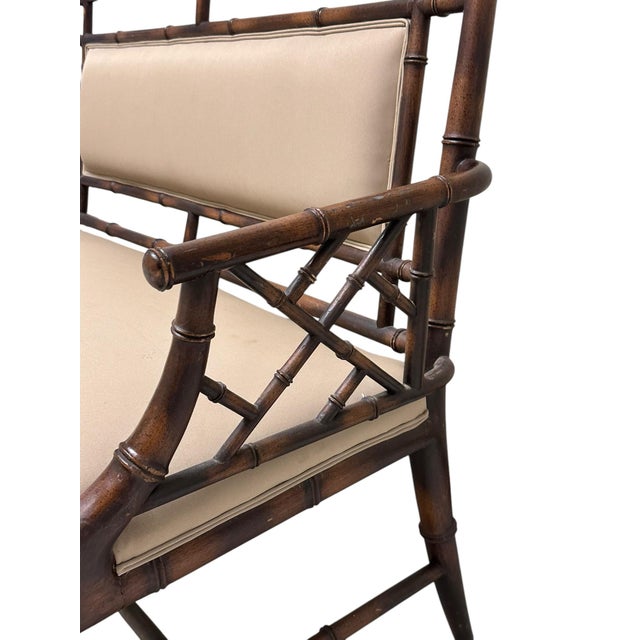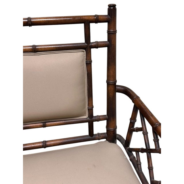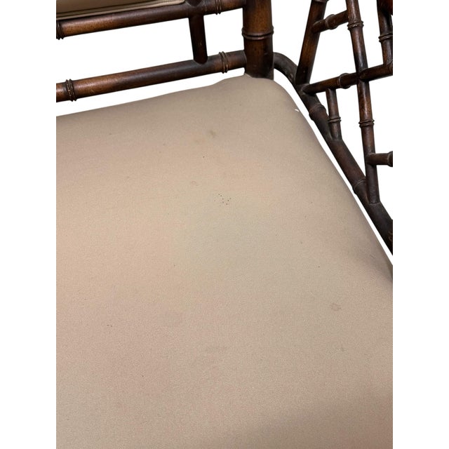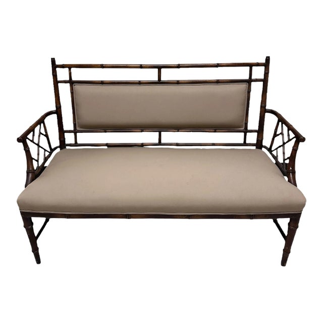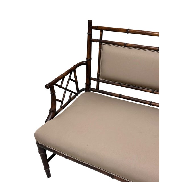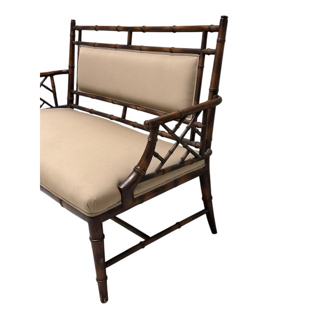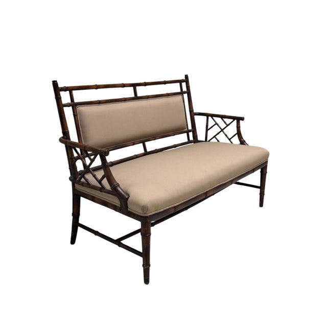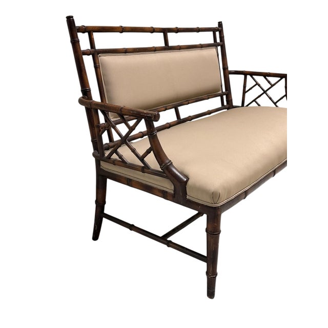 Vintage Chinese Chippendale Faux Bamboo Tan Upholstered Settee