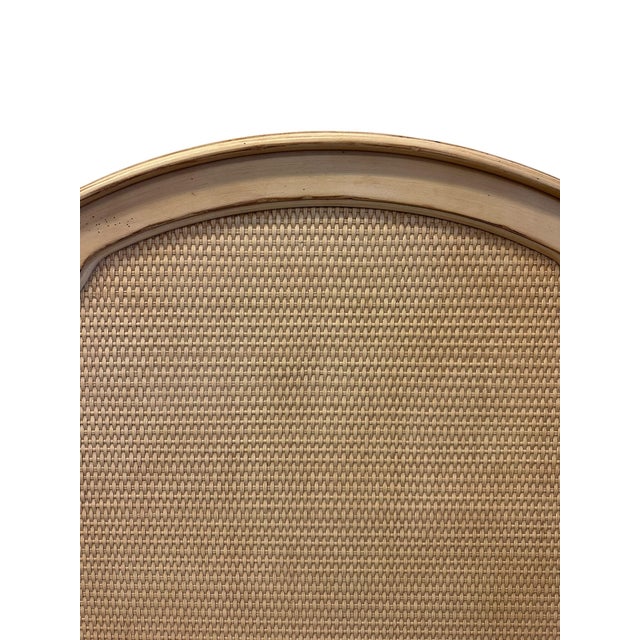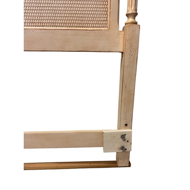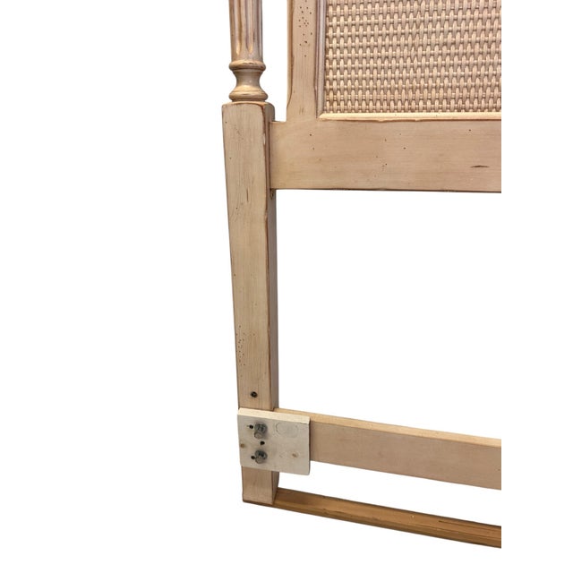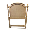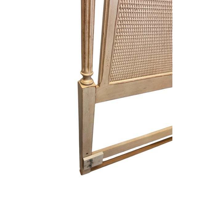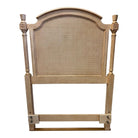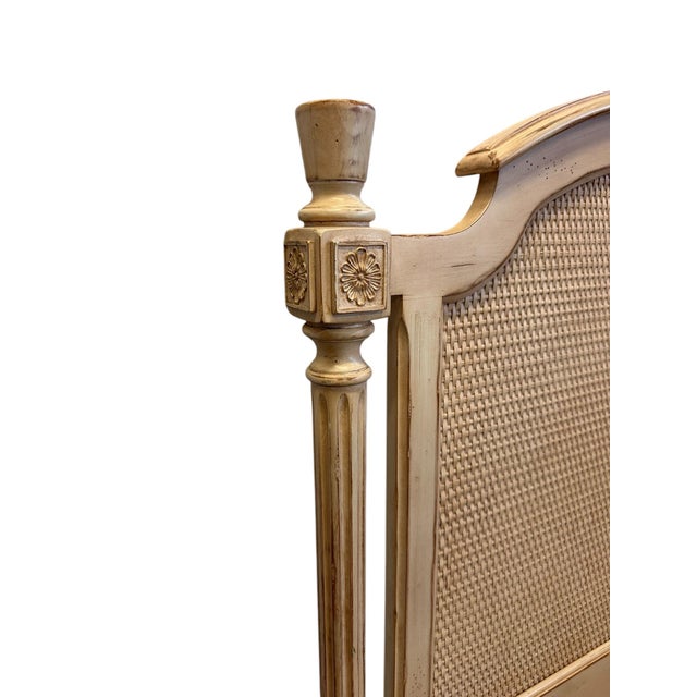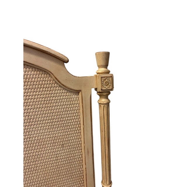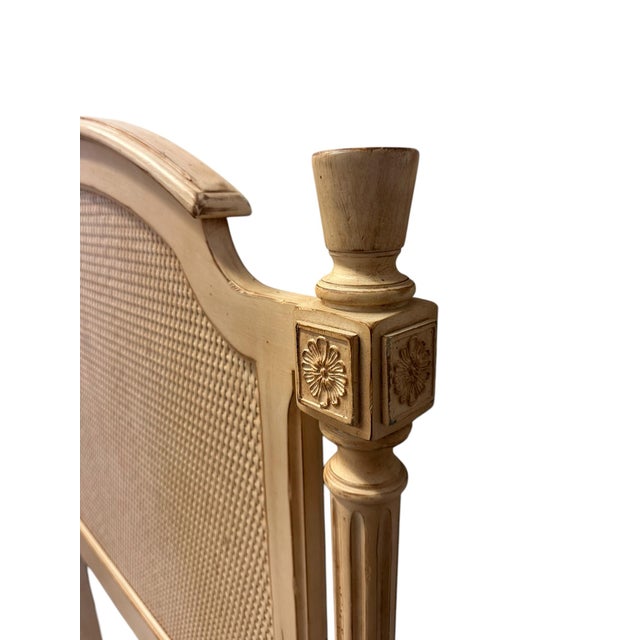 Charming and full of character, this vintage French Provincial headboard brings elegance to any bedroom. Crafted from wood with a warm, cream-toned finish, the headboard features a beautifully woven rattan center panel framed by carved detailing and fluted columns. The graceful arched top and rosette accents at each post add a romantic, old-world flair.