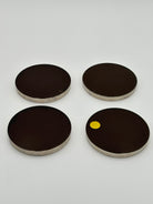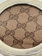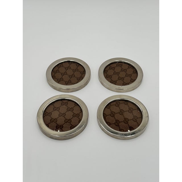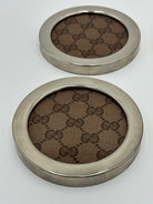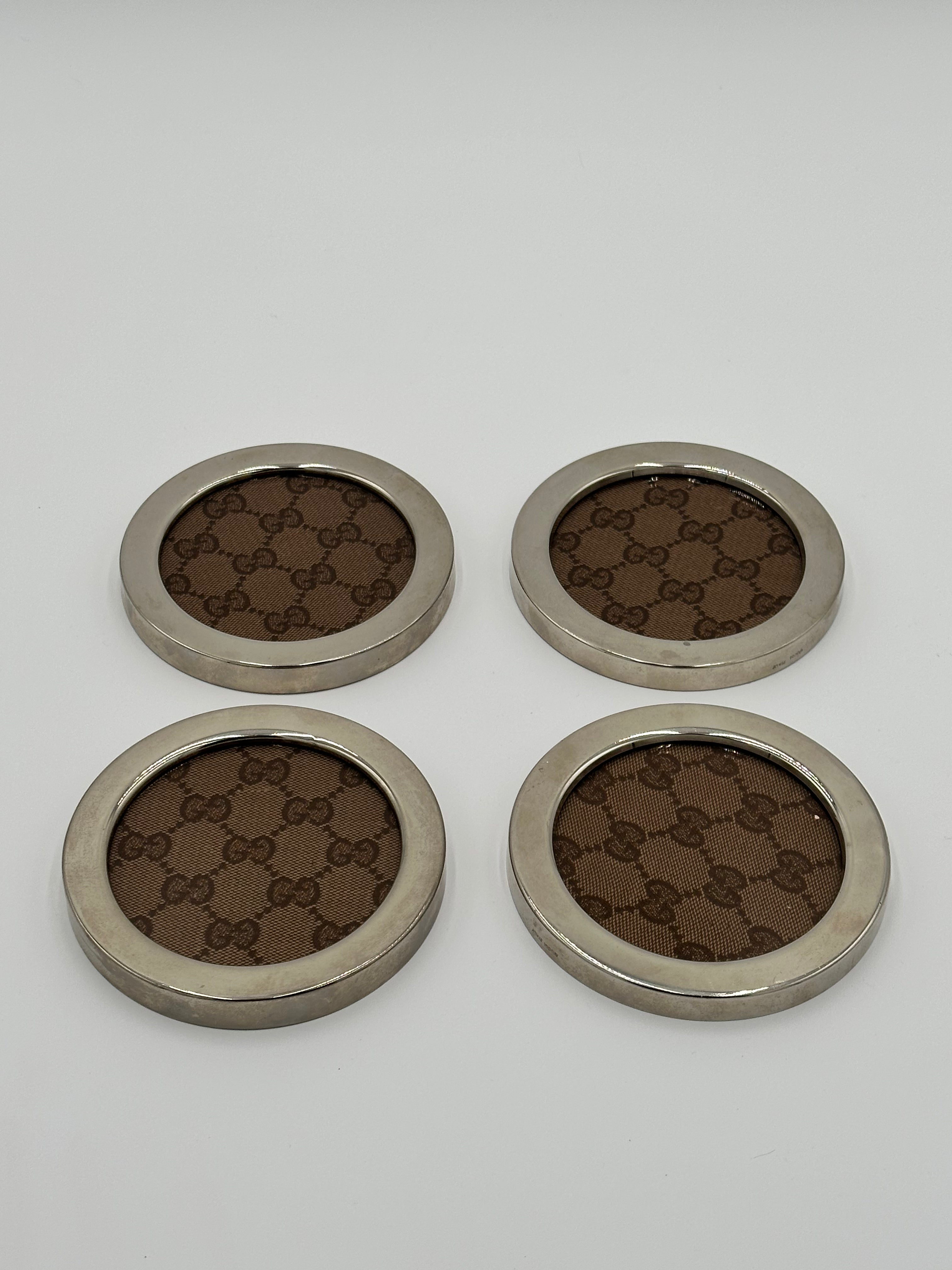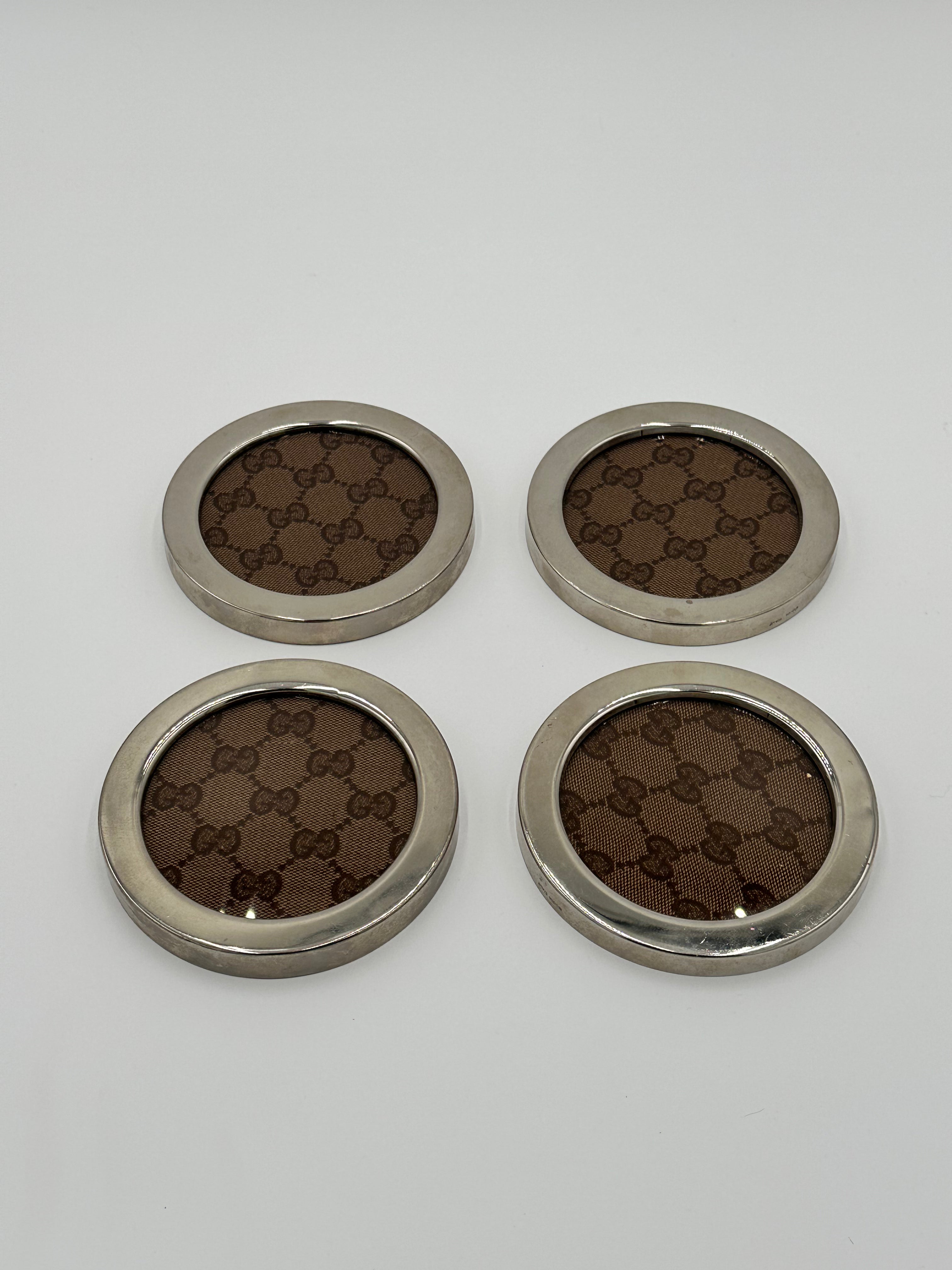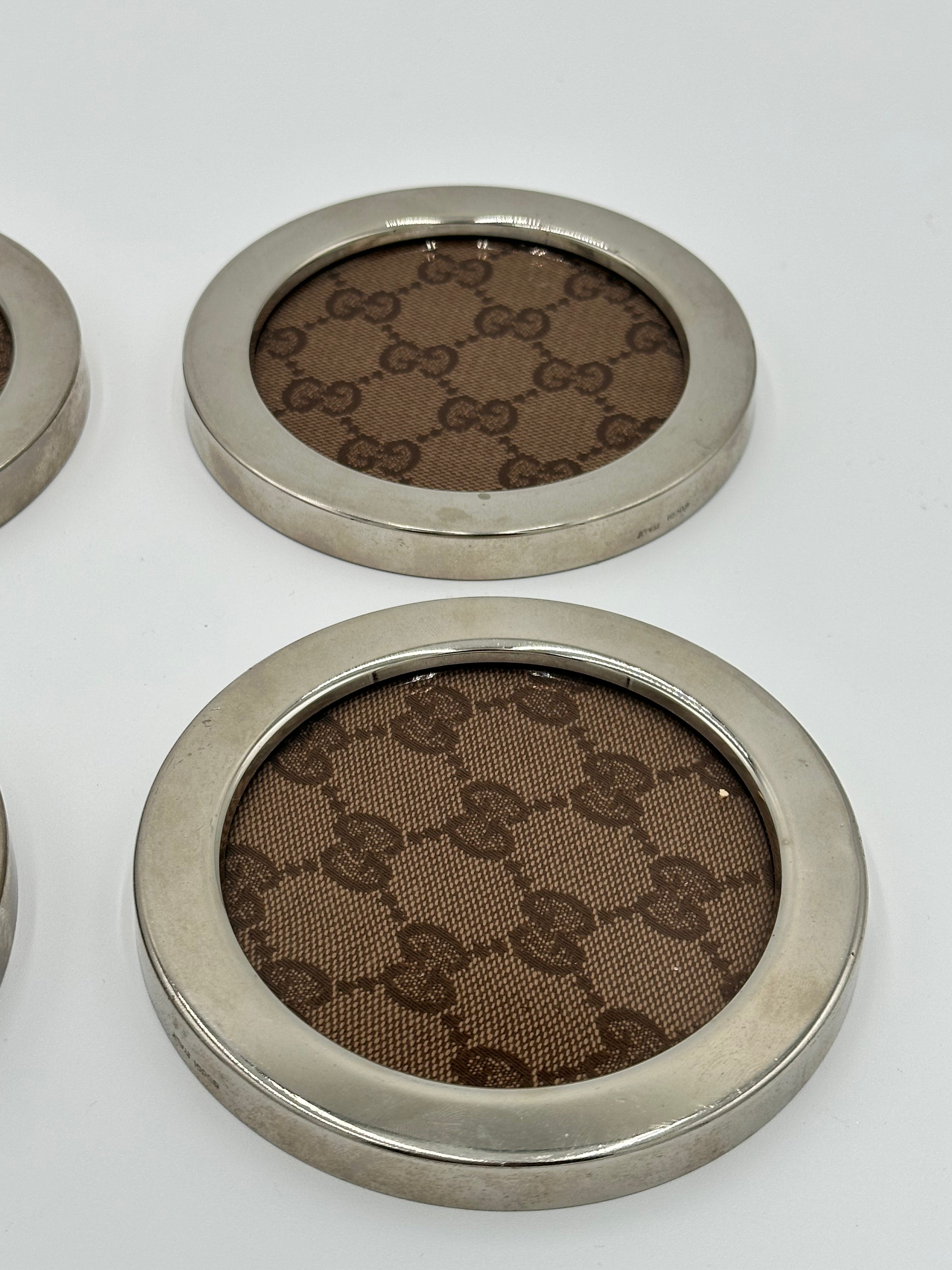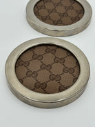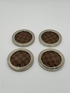 The coasters feature the classic brown gucci monogram logo surrounded by a circular silver-colored frame. A perfect elegant set for cocktail hour.