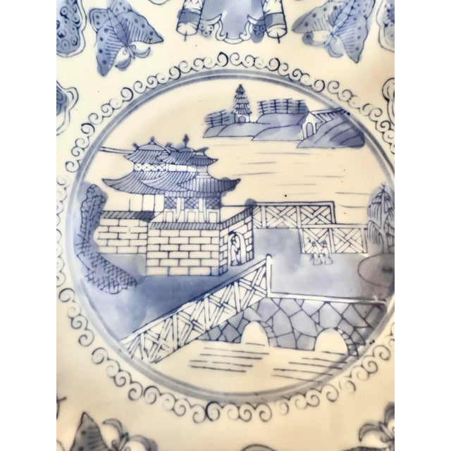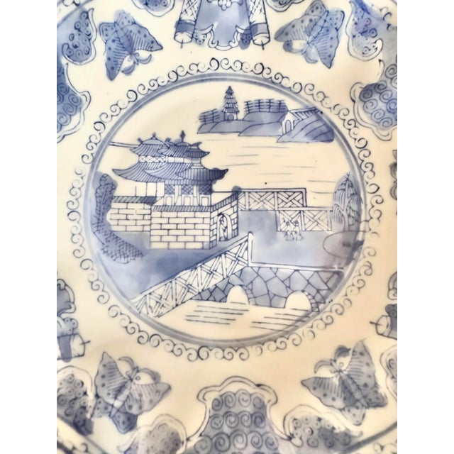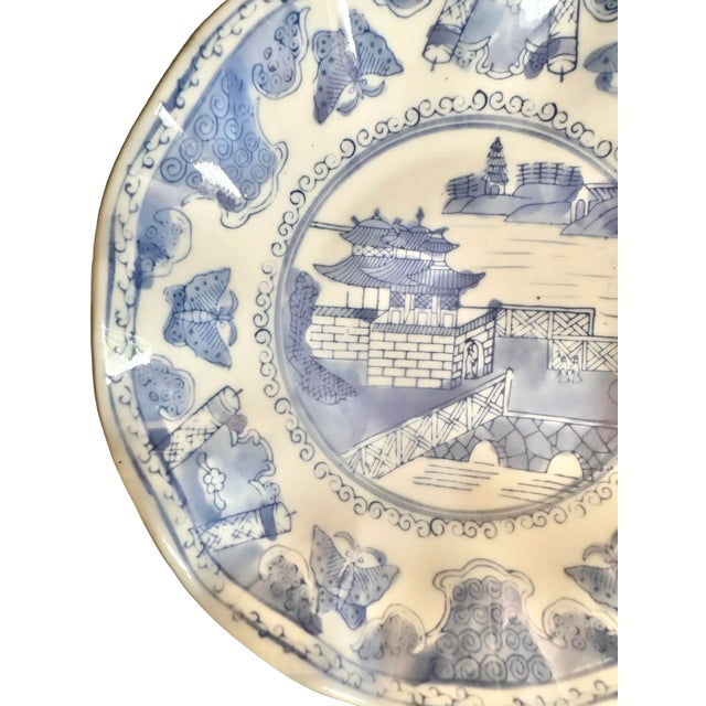 Beautiful Vintage Hand-Painted Blue and White Chinoiserie Ruffle Bowl With Island Pagoda Scene.