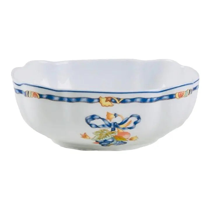 This beautiful Bernardaud Limoges 6.5” Lobed Bowl is in the classic Borghese Pattern, featuring a central elegant motif of an arrangement of grapes, leaves and flowers hanging from a French blue bow.