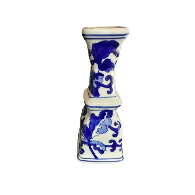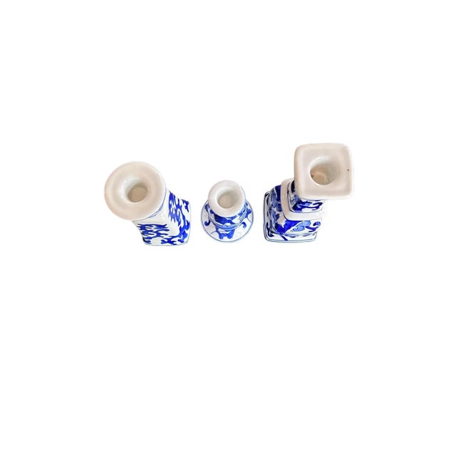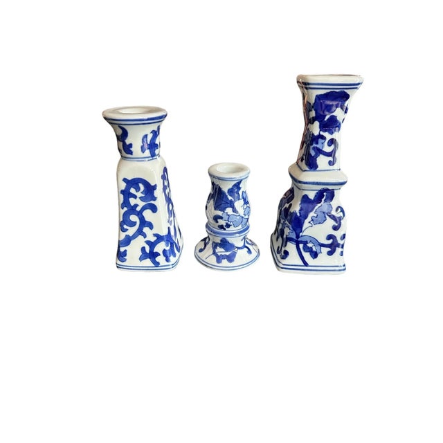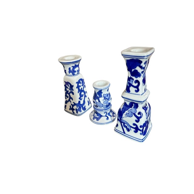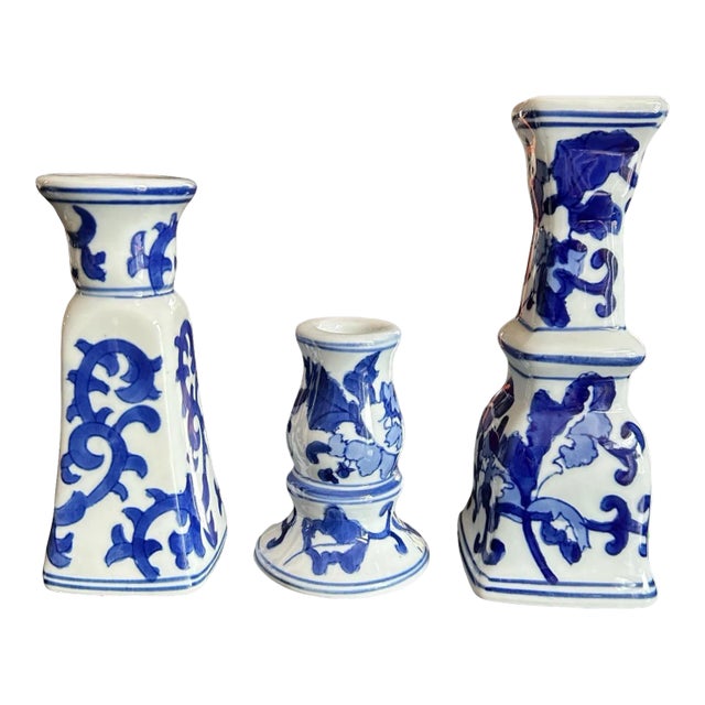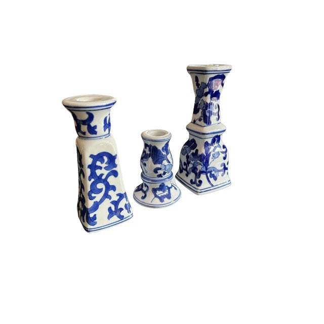 Beautiful set of 3 blue and white chinoiserie Silvestri candlestick holders.