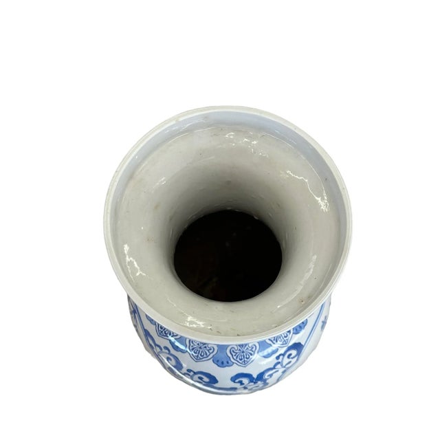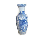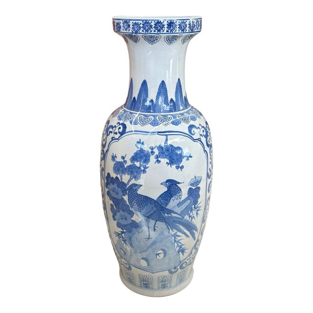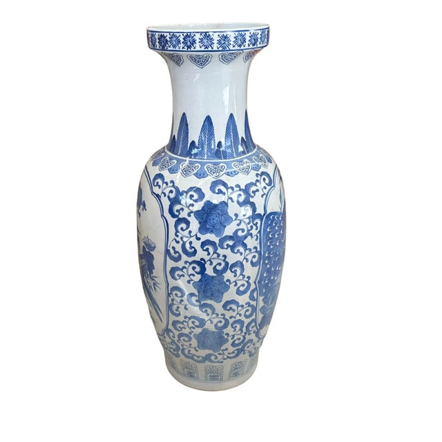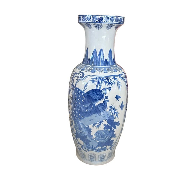 This wonderful vase features two large chinoiserie scenes with birds, trees, rocks, bamboo and flowers. The vase features asian inspired symbols on the rim and body of the vase.